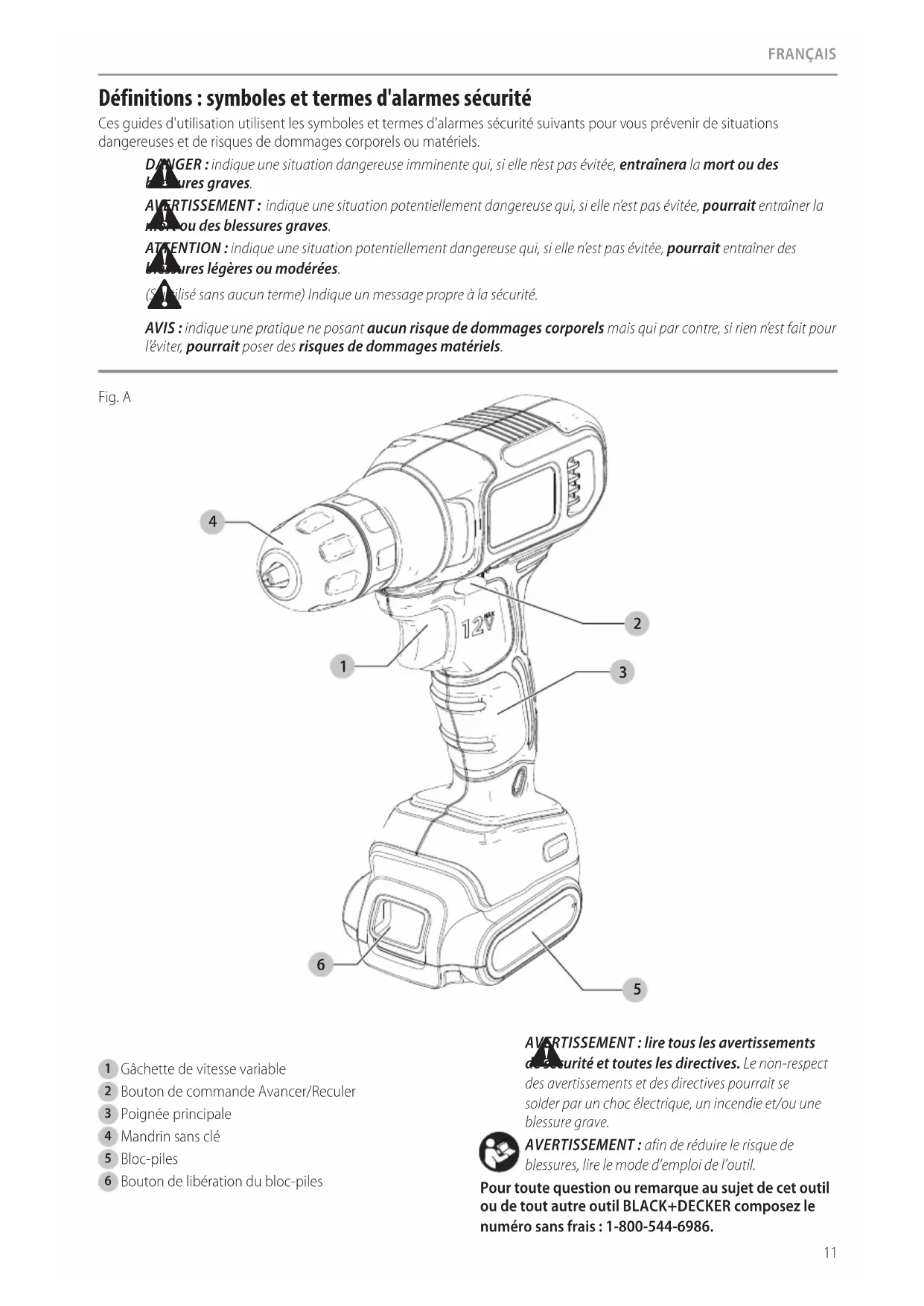 blessures, lire le mode d’emploi del’outil. Pour toute question ou remarque au sujet de cet outil ou de tout autre outil BLACK+DECKER composez le numéro sans frais : 1-800-544-6986. Fig. A