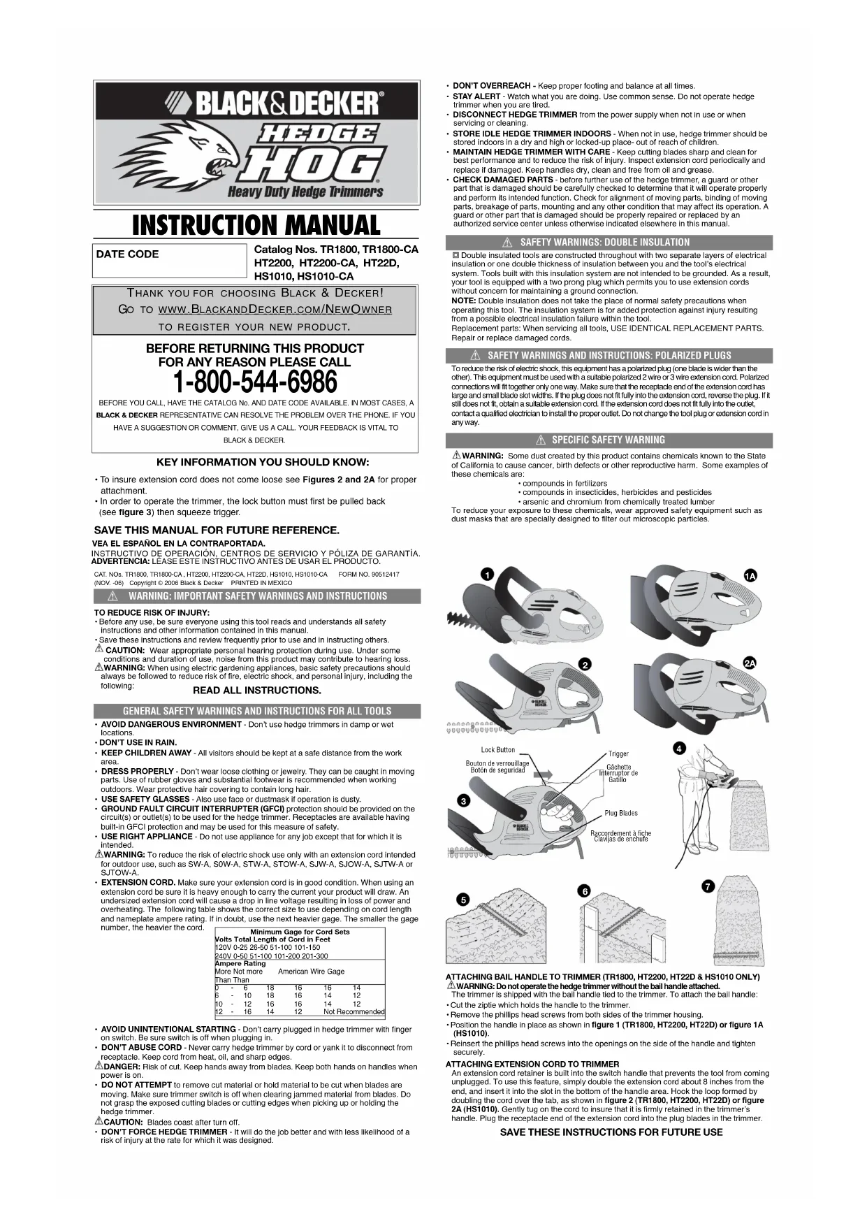 L’outil est livré avec l’anse attachée au taille-haie. Fixation de l’anse :• Couper l’attache de câble qui retient l’anse au taille-haie.• Retirer les vis à empreinte cruciforme des deux côtés du boîtier du taille-haie.• Positionner l’anse comme indiqué à la figure 1 (TR1800, HT2200 et HT22D) ou à la figure1A (HS1010).• Réinsérer les vis à empreinte cruciforme dans les ouvertures sur le côté de l’anse et serrersolidement.RACCORDEMENT DE LA RALLONGELa poignée à gâchette est munie d’un dispositif visant à retenir la rallonge et à l’empêcherde se débrancher du taille-haie. Pour insérer cette dernière dans le dispositif, il suffit de replier environ 8 po et d’insérer la boucle ainsi formée dans la fente située sous la poignée.Accrocher ensuite la boucle par-dessus l’onglet, tel qu’illustré aux figures 2 (TR1800,HT2200, HT22D) et 2A (HS1010). Tirer doucement sur la rallonge afin de s’assurer qu’elleest bien retenue dans la poignée. CONSERVER LES PRÉSENTES DIRECTIVES À TITRE DE RÉFÉRENCE