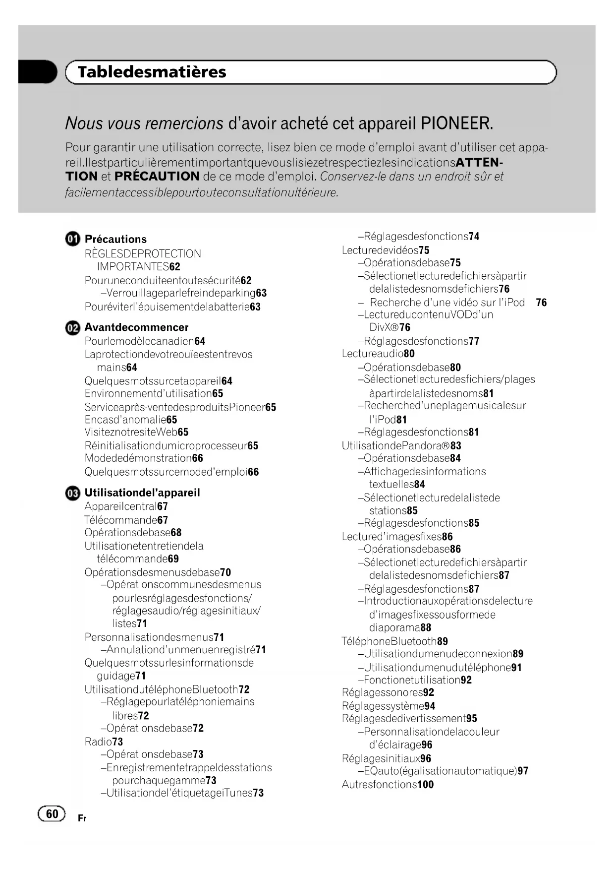 IMPORTANTES 62 Pour une conduite en toute sécurité 62 – Verrouillage par le frein de parking 63 Pour éviter l’épuisement de la batterie 63 Avant de commencer Pour le modèle canadien 64 La protection de votre ouïe est entre vos mains 64 Quelques mots sur cet appareil 64 Environnement d’utilisation 65 Service après-vente des produits Pioneer 65 En cas d’anomalie 65 Visitez notre site Web 65 Réinitialisation du microprocesseur 65 Mode de démonstration 66 Quelques mots sur ce mode d’emploi 66 Utilisation de l’appareil Appareil central 67 Télécommande 67 Opérations de base 68 Utilisation et entretien de la télécommande 69 Opérations des menus de base 70 – Opérations communes des menus pour les réglages des fonctions/ réglages audio/réglages initiaux/ listes 71 Personnalisation des menus 71 – Annulation d’un menu enregistré 71 Quelques mots sur les informations de guidage 71 Utilisation du téléphone Bluetooth 72 – Réglage pour la téléphonie mains libres 72 – Opérations de base 72 Radio 73 – Opérations de base 73 – Enregistrement et rappel des stations pour chaque gamme 73 – Utilisation de l’étiquetage iTunes 73 – Réglages des fonctions 74 Lecture de vidéos 75 – Opérations de base 75 – Sélection et lecture de fichiers à partir de la liste des noms de fichiers 76 – Recherche d’une vidéo sur l’iPod 76 – Lecture du contenu VOD d’un DivXâ 76 – Réglages des fonctions 77 Lecture audio 80 – Opérations de base 80 – Sélection et lecture des fichiers/plages à partir de la liste des noms 81 – Recherche d’une plage musicale sur l’iPod 81 – Réglages des fonctions 81 Utilisation de Pandoraâ 83 – Opérations de base 84 – Affichage des informations textuelles 84 – Sélection et lecture de la liste de stations 85 – Réglages des fonctions 85 Lecture d’images fixes 86 – Opérations de base 86 – Sélection et lecture de fichiers à partir de la liste des noms de fichiers 87 – Réglages des fonctions 87 – Introduction aux opérations de lecture d’images fixes sous forme de diaporama 88 Téléphone Bluetooth 89 – Utilisation du menu de connexion 89 – Utilisation du menu du téléphone 91 – Fonction et utilisation 92 Réglages sonores 92 Réglages système 94 Réglages de divertissement 95 – Personnalisation de la couleur d’éclairage 96 Réglages initiaux 96 – EQ auto (égalisation automatique) 97 Autres fonctions 100 Table des matières