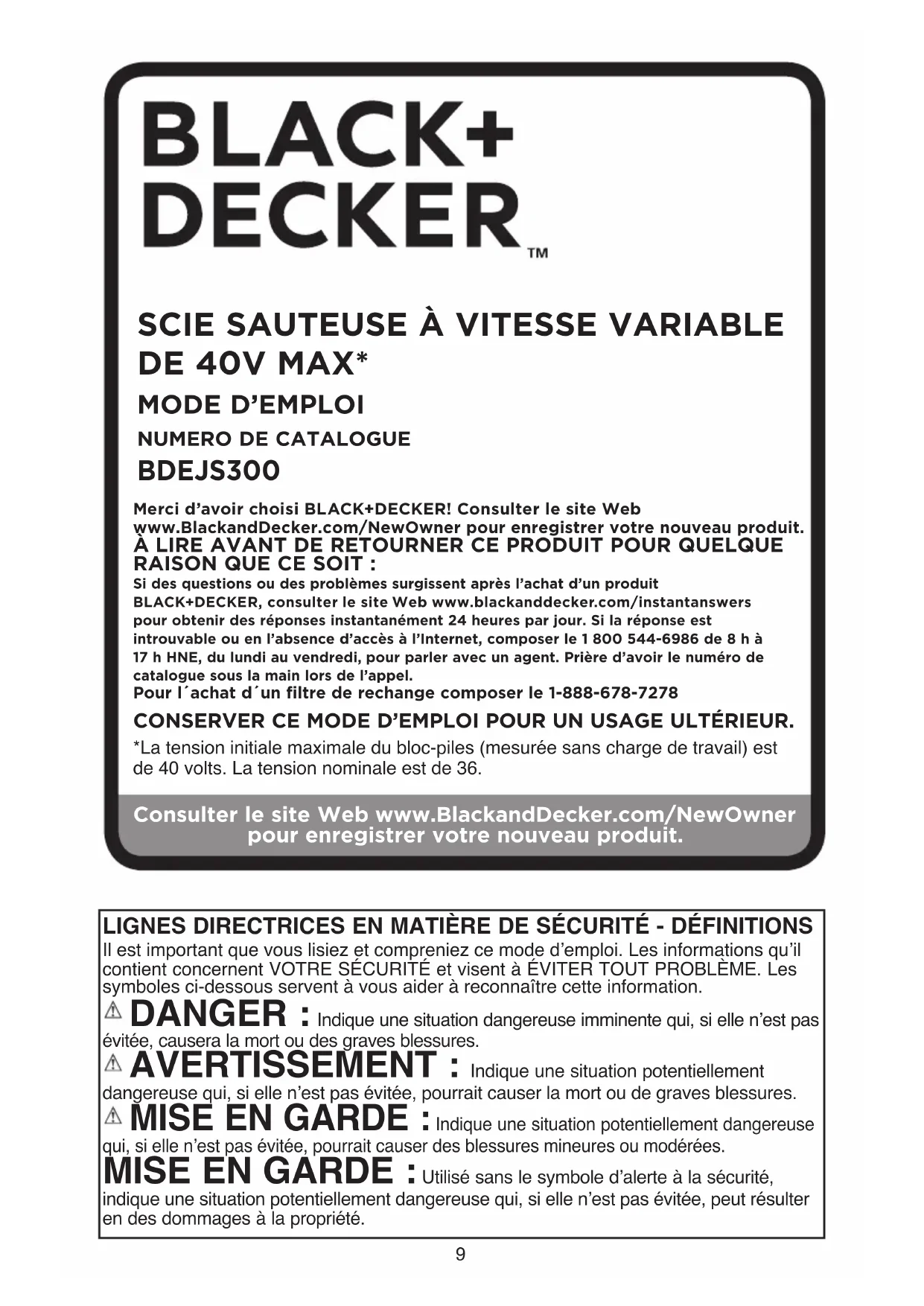 Merci d’avoir choisi BLACK+DECKER! Consulter le site Web www.BlackandDecker.com/NewOwner pour enregistrer votre nouveau produit.ÀLIRE AVANT DE RETOURNER CE PRODUIT POUR QUELQUE RAISON QUE CE SOIT :Si des questions ou des problèmes surgissent après l’achat d’un produit BLACK+DECKER, consulter le site Web www.blackanddecker.com/instantanswers pour obtenir des réponses instantanément 24 heures par jour. Si la réponse est introuvable ou en l’absence d’accès à l’Internet, composer le 1 800 544-6986 de 8 h à 17 h HNE, du lundi au vendredi, pour parler avec un agent. Prière d’avoir le numéro de catalogue sous la main lors de l’appel.Pour l´achat d´un filtre de rechange composer le 1-888-678-7278CONSERVER CE MODE D’EMPLOI POUR UN USAGE ULTÉRIEUR.*Latensioninitialemaximaledubloc-piles(mesuréesanschargedetravail)estde40volts.Latensionnominaleestde36.NUMERO DE CATALOGUE BDEJS30010 AVERTISSEMENTS DE