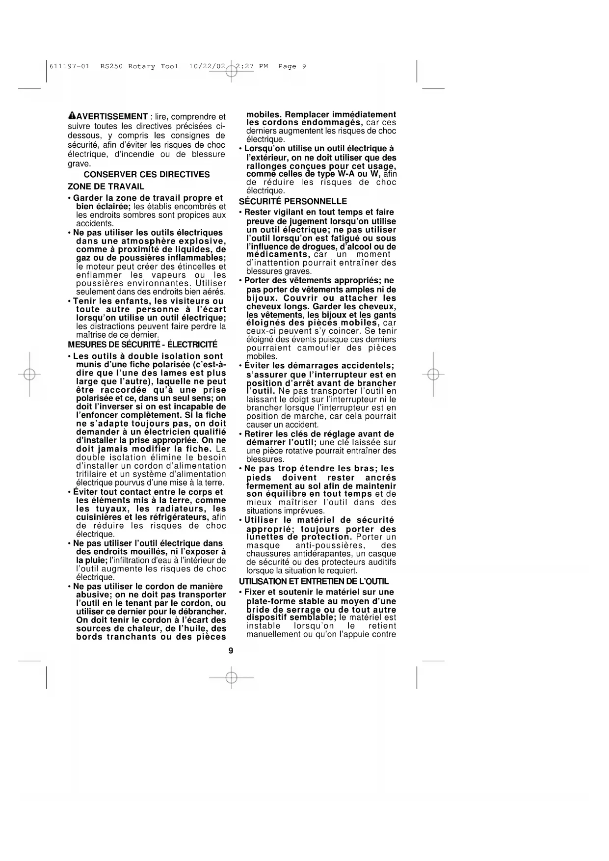 - Fixer et soutenir le matériel sur une plate-forme stable au moyen d’une bride de serrage ou de tout autre dispositif semblable; le matériel est instable lorsqu’on le retient manuellement ou qu’on l’appuie contre 611197-01 RS250 Rotary Tool 10/22/02 2:27 PM Page 910 le corps, ce qui peut faire perdre la maîtrise de l’outil.