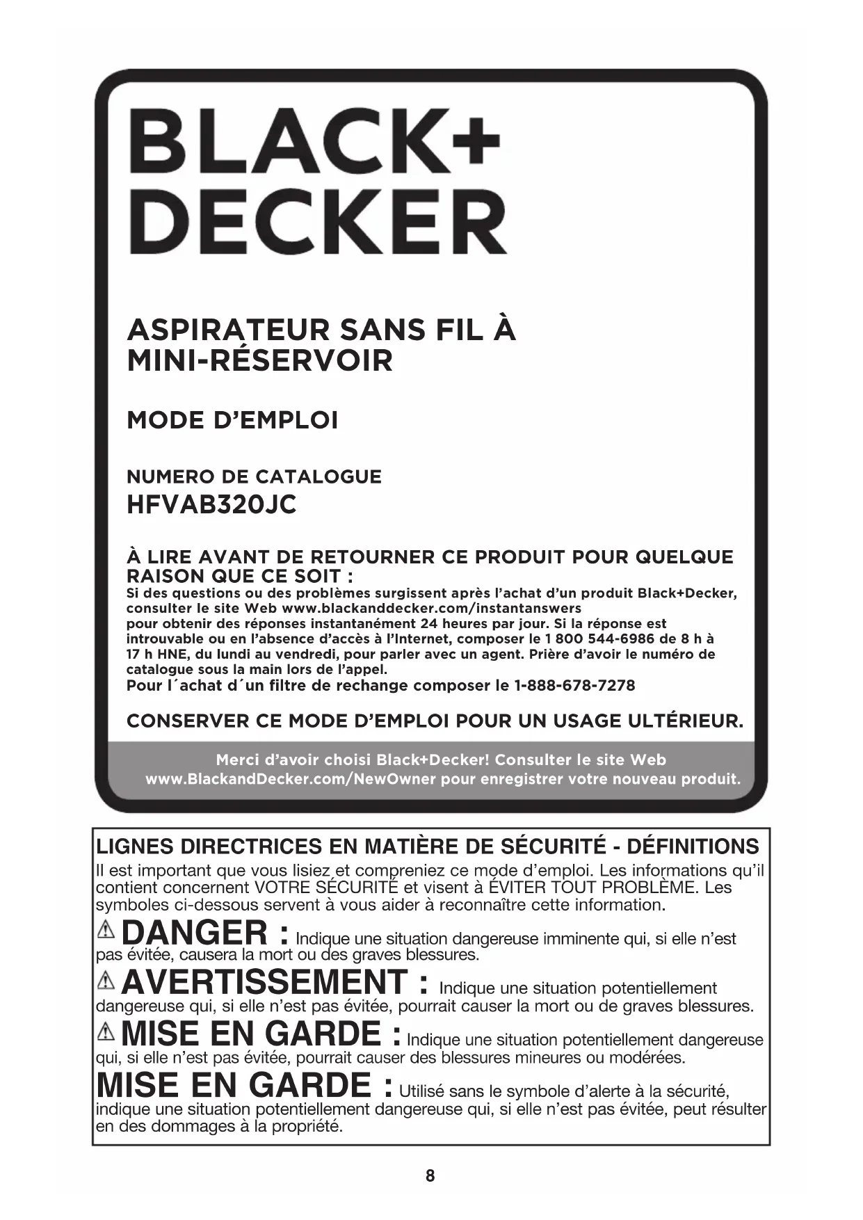 MINI-RÉSERVOIR ÀLIRE AVANT DE RETOURNER CE PRODUIT POUR QUELQUE RAISON QUE CE SOIT : Si des questions ou des problèmes surgissent après l’achat d’un produit Black+Decker, consulter le site Web www.blackanddecker.com/instantanswers pour obtenir des réponses instantanément 24 heures par jour. Si la réponse est introuvable ou en l’absence d’accès à l’Internet, composer le 1 800 544-6986 de 8 h à 17 h HNE, du lundi au vendredi, pour parler avec un agent. Prière d’avoir le numéro de catalogue sous la main lors de l’appel.Pour l´achat d´un filtre de rechange composer le 1-888-678-7278CONSERVER CE MODE D’EMPLOI POUR UN USAGE ULTÉRIEUR. Merci d’avoir choisi Black+Decker! Consulter le site Web www.BlackandDecker.com/NewOwner pour enregistrer votre nouveau produit. LIGNES DIRECTRICES EN MATIÈRE DE SÉCURITÉ - DÉFINITIONS Il est important que vous lisiez et compreniez ce mode d’emploi. Les informations qu’il contient concernent VOTRE SÉCURITÉ et visent à ÉVITER TOUT PROBLÈME. Les symboles ci-dessous servent à vous aider à reconnaître cette information.