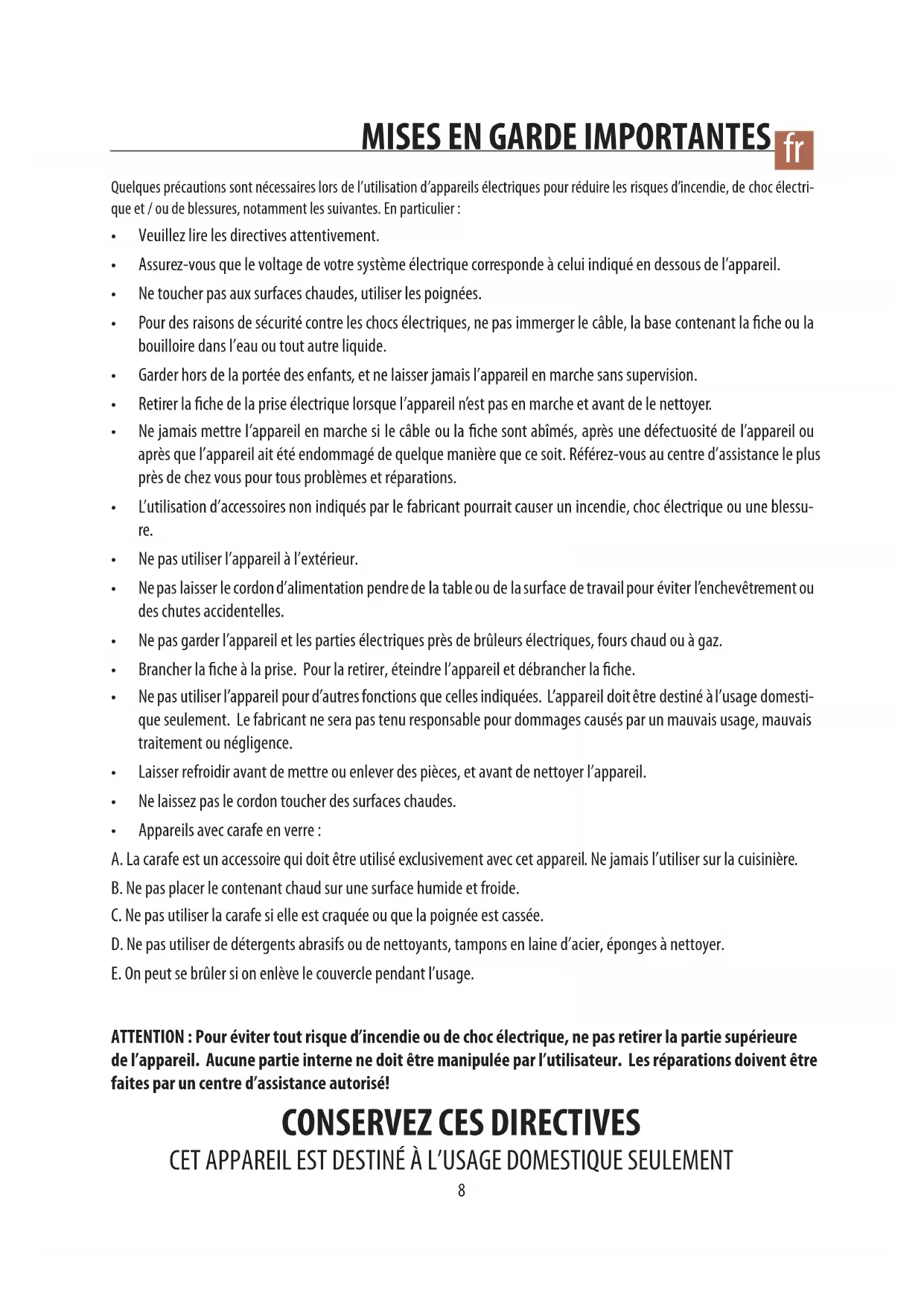 - Appareilsaveccarafeenverre: A.Lacarafeestunaccessoirequidoitêtreutiliséexclusivementaveccetappareil.Nejamaisl’utilisersurlacuisinière. B.Nepasplacerlecontenantchaudsurunesurfacehumideetfroide. C.Nepasutiliserlacarafesielleestcraquéeouquelapoignéeestcassée. D.Nepasutiliserdedétergentsabrasifsoudenettoyants,tamponsenlained’acier,épongesànettoyer. E.Onpeutsebrûlersionenlèvelecouverclependantl’usage. ATTENTION : Pour éviter tout risque d’incendie ou de choc électrique, ne pas retirer la partie supérieure de l’appareil. Aucune partie interne ne doit être manipulée par l’utilisateur. Les réparations doivent être faites par un centre d’assistance autorisé!
