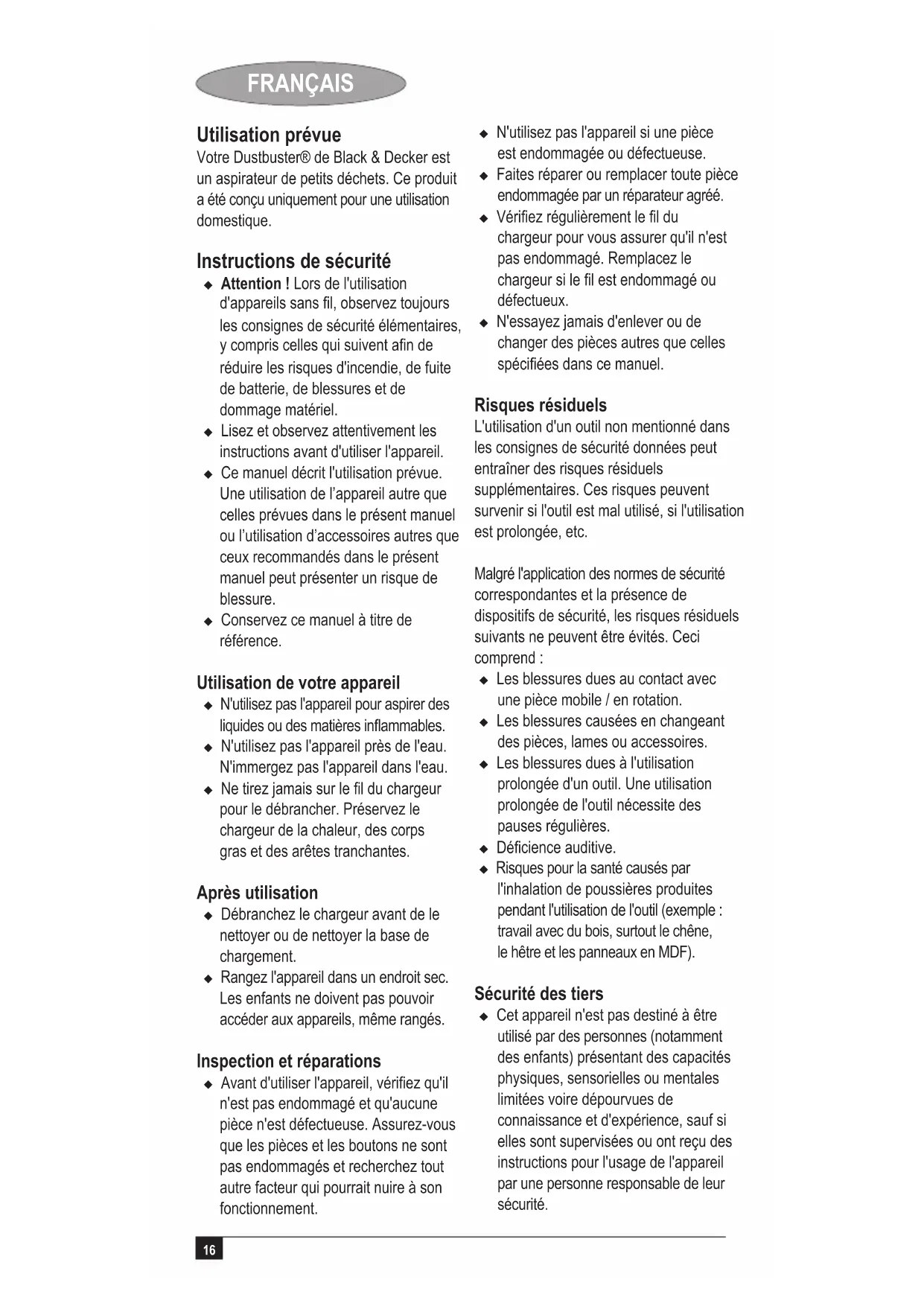 Garantie Black & Decker vertraut auf die Qualität der eigenen Geräte und bietet dem Käufer eine außergewöhnliche Garantie. Diese Garantiezusage versteht sich unbeschadet der gesetzlichen Gewährleistungsansprüche und schränkt diese keinesfalls ein. Sie gilt in sämtlichen Mitgliedsstaaten der Europäischen Union und der Europäischen Freihandelszone EFTA. Tritt innerhalb von 24 Monaten ab Kaufdatum an einem Gerät von Black & Decker ein auf Material- oder Verarbeitungsfehler zurückzuführender Mangel auf, garantiert Black & Decker den Austausch defekter Teile, die Reparatur von Geräten mit üblichem Verschleiß bzw. den Austausch eines mangelhaften Geräts, ohne den Kunden dabei mehr als unbedingt nötig in Anspruch zu nehmen, allerdings vorbehaltlich folgender Ausnahmen: u wenn das Gerät gewerblich, beruich oder im Verleihgeschäft benutzt wurde; u wenn das Gerät mißbräuchlich verwendet oder mit mangelnder Sorgfalt behandelt wurde; u wenn das Gerät durch irgendwelche Fremdeinwirkung beschädigt wurde; u wenn ein unbefugter Reparaturversuch durch anderes Personal als das einer Vertragswerkstatt oder des Black & Decker-Kundendienstes unternommen wurde. Zur Inanspruchnahme dieser Garantie ist dem Verkäufer bzw. der Vertragswerkstatt ein Kaufnachweis vorzulegen. Der Kaufnachweis muß Kaufdatum und Gerätetyp bescheinigen. Die Adresse des zuständigen Büros von Black & Decker steht in dieser Anleitung, darüber läßt sich die nächstgelegene Vertragswerkstatt ermitteln. Außerdem ist eine Liste der Vertragswerkstätten und aller Kundendienststellen von Black & Decker sowie der zuständigen Ansprechpartner im Internet zu nden unter: www.2helpU.com Bitte besuchen Sie untere Webseite www.blackanddecker.de, um Ihr neues Black & Decker Produkt zu registrieren und über neue Produkte und Sonderangebote aktuell informiert zu werden. Weitere Informationen über die Marke Black & Decker und unsere Produkte nden Sie unter www.blackanddecker.de16 FRANÇAIS Utilisation prévue Votre Dustbuster® de Black & Decker est un aspirateur de petits déchets. Ce produit a été conçu uniquement pour une utilisation domestique. Instructions de sécurité u Attention ! Lors de l'utilisation d'appareils sans l, observez toujours les consignes de sécurité élémentaires, y compris celles qui suivent an de réduire les risques d'incendie, de fuite de batterie, de blessures et de dommage matériel. u Lisez et observez attentivement les instructions avant d'utiliser l'appareil. u Ce manuel décrit l'utilisation prévue. Une utilisation de l’appareil autre que celles prévues dans le présent manuel ou l’utilisation d’accessoires autres que ceux recommandés dans le présent manuel peut présenter un risque de blessure. u Conservez ce manuel à titre de référence. Utilisation de votre appareil u N'utilisez pas l'appareil pour aspirer des liquides ou des matières inammables. u N'utilisez pas l'appareil près de l'eau. N'immergez pas l'appareil dans l'eau. u Ne tirez jamais sur le l du chargeur pour le débrancher. Préservez le chargeur de la chaleur, des corps gras et des arêtes tranchantes. Après utilisation u Débranchez le chargeur avant de le nettoyer ou de nettoyer la base de chargement. u Rangez l'appareil dans un endroit sec. Les enfants ne doivent pas pouvoir accéder aux appareils, même rangés. Inspection et réparations u Avant d'utiliser l'appareil, vériez qu'il n'est pas endommagé et qu'aucune pièce n'est défectueuse. Assurez-vous que les pièces et les boutons ne sont pas endommagés et recherchez tout autre facteur qui pourrait nuire à son fonctionnement. u N'utilisez pas l'appareil si une pièce est endommagée ou défectueuse. u Faites réparer ou remplacer toute pièce endommagée par un réparateur agréé. u Vériez régulièrement le l du chargeur pour vous assurer qu'il n'est pas endommagé. Remplacez le chargeur si le l est endommagé ou défectueux. u N'essayez jamais d'enlever ou de changer des pièces autres que celles spéciées dans ce manuel. Risques résiduels L'utilisation d'un outil non mentionné dans les consignes de sécurité données peut entraîner des risques résiduels supplémentaires. Ces risques peuvent survenir si l'outil est mal utilisé, si l'utilisation est prolongée, etc. Malgré l'application des normes de sécurité correspondantes et la présence de dispositifs de sécurité, les risques résiduels suivants ne peuvent être évités. Ceci comprend : u Les blessures dues au contact avec une pièce mobile / en rotation. u Les blessures causées en changeant des pièces, lames ou accessoires. u Les blessures dues à l'utilisation prolongée d'un outil. Une utilisation prolongée de l'outil nécessite des pauses régulières. u Décience auditive.u Risques pour la santé causés par l'inhalation de poussières produites pendant l'utilisation de l'outil (exemple : travail avec du bois, surtout le chêne, le hêtre et les panneaux en MDF). Sécurité des tiers u Cet appareil n'est pas destiné à être utilisé par des personnes (notamment des enfants) présentant des capacités physiques, sensorielles ou mentales limitées voire dépourvues de connaissance et d'expérience, sauf si elles sont supervisées ou ont reçu des instructions pour l'usage de l'appareil par une personne responsable de leur sécurité.17 FRANÇAIS u Les enfants ne doivent pas jouer avec l'appareil. Instructions de sécurité supplémentaires pour les batteries et chargeurs Batteries u Ne tentez jamais d'ouvrir pour quelque raison que ce soit. u N'exposez pas la batterie à l'humidité.u N’exposez pas la batterie à la chaleur.u Ne rangez pas dans des endroits dont la température peut dépasser 40 °C. u Chargez uniquement à une température ambiante entre 10 °C et 40 °C. u Chargez uniquement avec le chargeur fourni avec l'outil/appareil. u Pour la mise au rebut des batteries, suivez les instructions de la section "Protection de l'environnement". u N'endommag