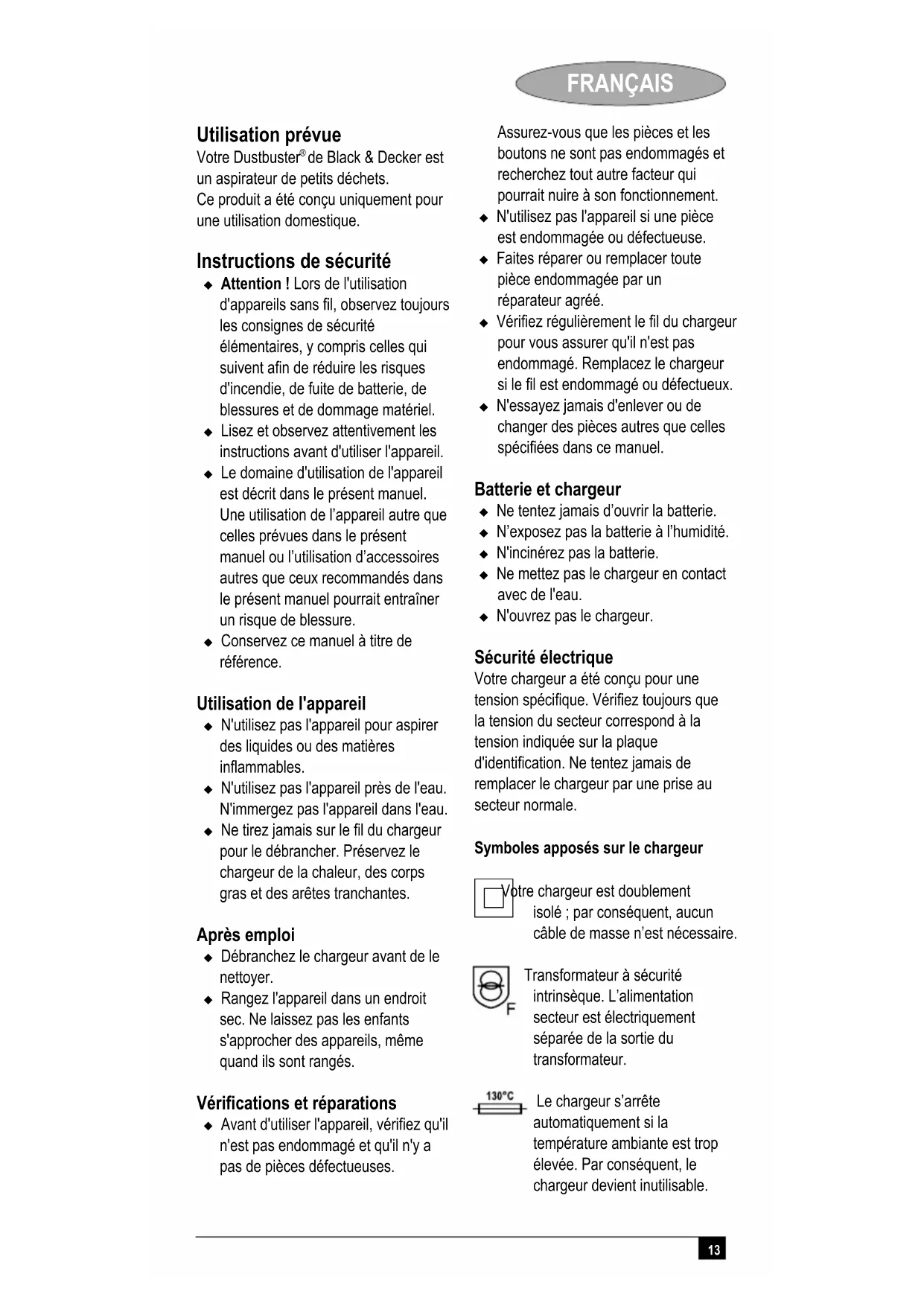 de Black & Decker est un aspirateur de petits déchets. Ce produit a été conçu uniquement pour une utilisation domestique. Instructions de sécurité Attention ! Lors de l'utilisation d'appareils sans fil, observez toujours les consignes de sécurité élémentaires, y compris celles qui suivent afin de réduire les risques d'incendie, de fuite de batterie, de blessures et de dommage matériel. Lisez et observez attentivement les instructions avant d'utiliser l'appareil. Le domaine d'utilisation de l'appareil est décrit dans le présent manuel. Une utilisation de l’appareil autre que celles prévues dans le présent manuel ou l’utilisation d’accessoires autres que ceux recommandés dans le présent manuel pourrait entraîner un risque de blessure. Conservez ce manuel à titre de référence. Utilisation de l'appareil N'utilisez pas l'appareil pour aspirer des liquides ou des matières inflammables. N'utilisez pas l'appareil près de l'eau. N'immergez pas l'appareil dans l'eau. Ne tirez jamais sur le fil du chargeur pour le débrancher. Préservez le chargeur de la chaleur, des corps gras et des arêtes tranchantes. Après emploi Débranchez le chargeur avant de le nettoyer. Rangez l'appareil dans un endroit sec. Ne laissez pas les enfants s'approcher des appareils, même quand ils sont rangés. Vérifications et réparations Avant d'utiliser l'appareil, vérifiez qu'il n'est pas endommagé et qu'il n'y a pas de pièces défectueuses. Assurez-vous que les pièces et les boutons ne sont pas endommagés et recherchez tout autre facteur qui pourrait nuire à son fonctionnement. N'utilisez pas l'appareil si une pièce est endommagée ou défectueuse. Faites réparer ou remplacer toute pièce endommagée par un réparateur agréé. Vérifiez régulièrement le fil du chargeur pour vous assurer qu'il n'est pas endommagé. Remplacez le chargeur si le fil est endommagé ou défectueux. N'essayez jamais d'enlever ou de changer des pièces autres que celles spécifiées dans ce manuel. Batterie et chargeur Ne tentez jamais d’ouvrir la batterie. N’exposez pas la batterie à l’humidité. N'incinérez pas la batterie. Ne mettez pas le chargeur en contact avec de l'eau. N'ouvrez pas le chargeur. Sécurité électrique Votre chargeur a été conçu pour une tension spécifique. Vérifiez toujours que la tension du secteur correspond à la tension indiquée sur la plaque d'identification. Ne tentez jamais de remplacer le chargeur par une prise au secteur normale. Symboles apposés sur le chargeur