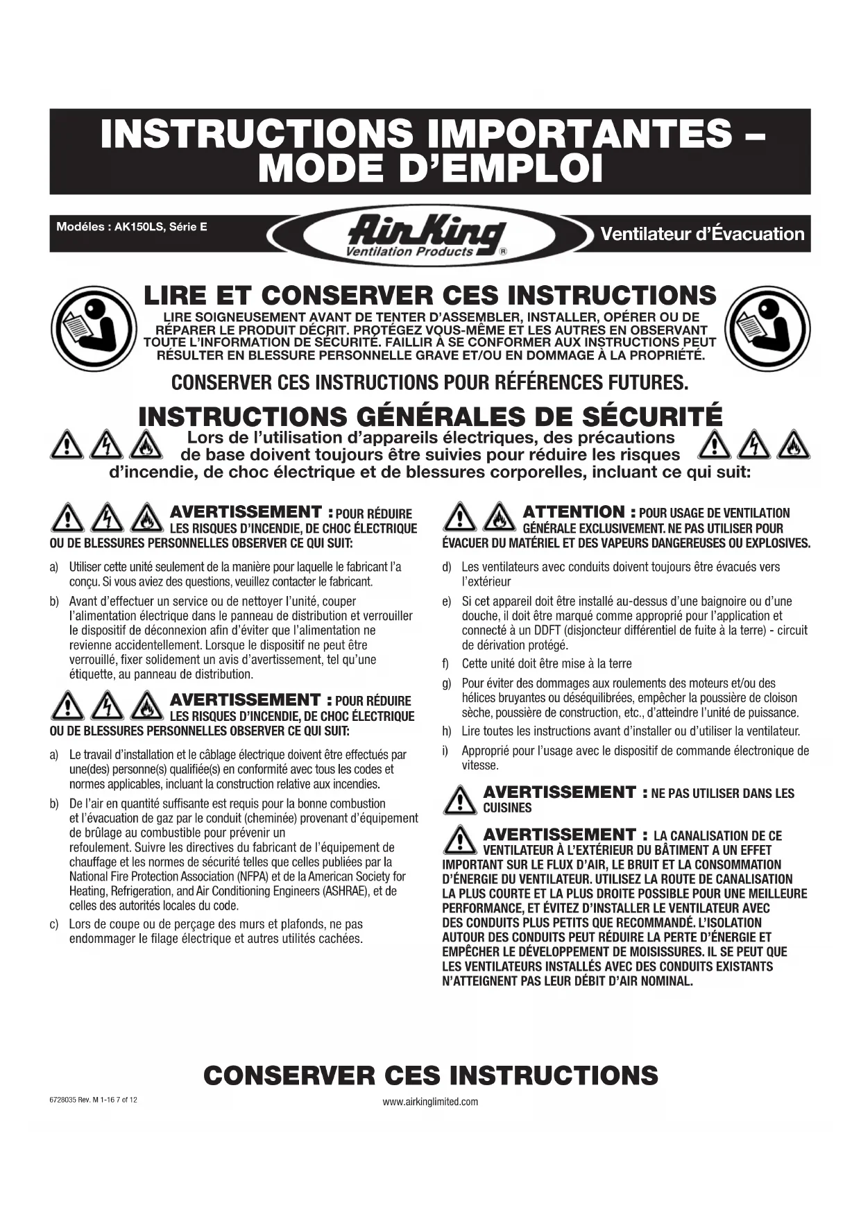 QUE FERA AIR KING: Au cours de la période de garantie, Air King, à son choix, réparera ou remplacera n'importe quelle partie ou pièces qui s'avèrent défectueuses ou remplacera le produit entier par le même modèle ou un modèle comparable.