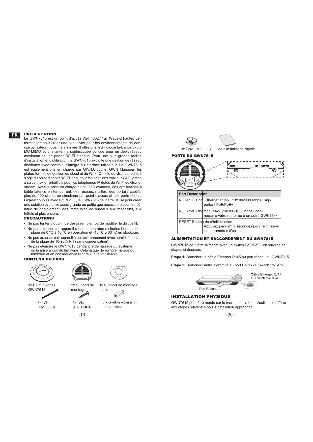 rectamente a la interfaz de conguración de la GWN7615, o escriba manualmente la dirección IP que se muestra en su navegador.~19~ ~20~ PRESENTATION Le GWN7615 est un point d’accès Wi-Fi 802.11ac Wave-2 hautes per- formances pour créer une évolutivité pour les environnements de den- sité utilisateur moyenne à élevée. Il offre une technologie bi-bande 3×3:3 MU-MIMO et une antenne sophistiquée conçue pour un débit réseau maximum et une portée Wi-Fi étendue. Pour une plus grande facilité d’installation et d’utilisation, le GWN7615 exploite une gestion de réseau distribuée avec contrôleur intégré à l’interface utilisateur. Le GWN7615 est également pris en charge par GWN.Cloud et GWN Manager, les plates-formes de gestion du cloud et du Wi-Fi On-site de Grandstream. Il s’agit du point d’accès Wi-Fi idéal pour les solutions voix sur Wi-Fi grâce à sa connexion infaillible pour les téléphones IP dotés de Wi-Fi de Grand- stream. Avec la prise en charge d’une QoS avancée, des applications à faible latence en temps réel, des réseaux maillés, des portails captifs, plus de 200 clients en simultané par point d’accès et des ports réseau Gigabit doubles avec PoE/PoE+, le GWN7615 peut être utilisé pour créer une solution évolutive aussi grande ou petite que nécessaire pour le scé- nario de déploiement, des immeubles de bureaux aux magasins, aux hôtels et plus encore. PRECAUTIONS