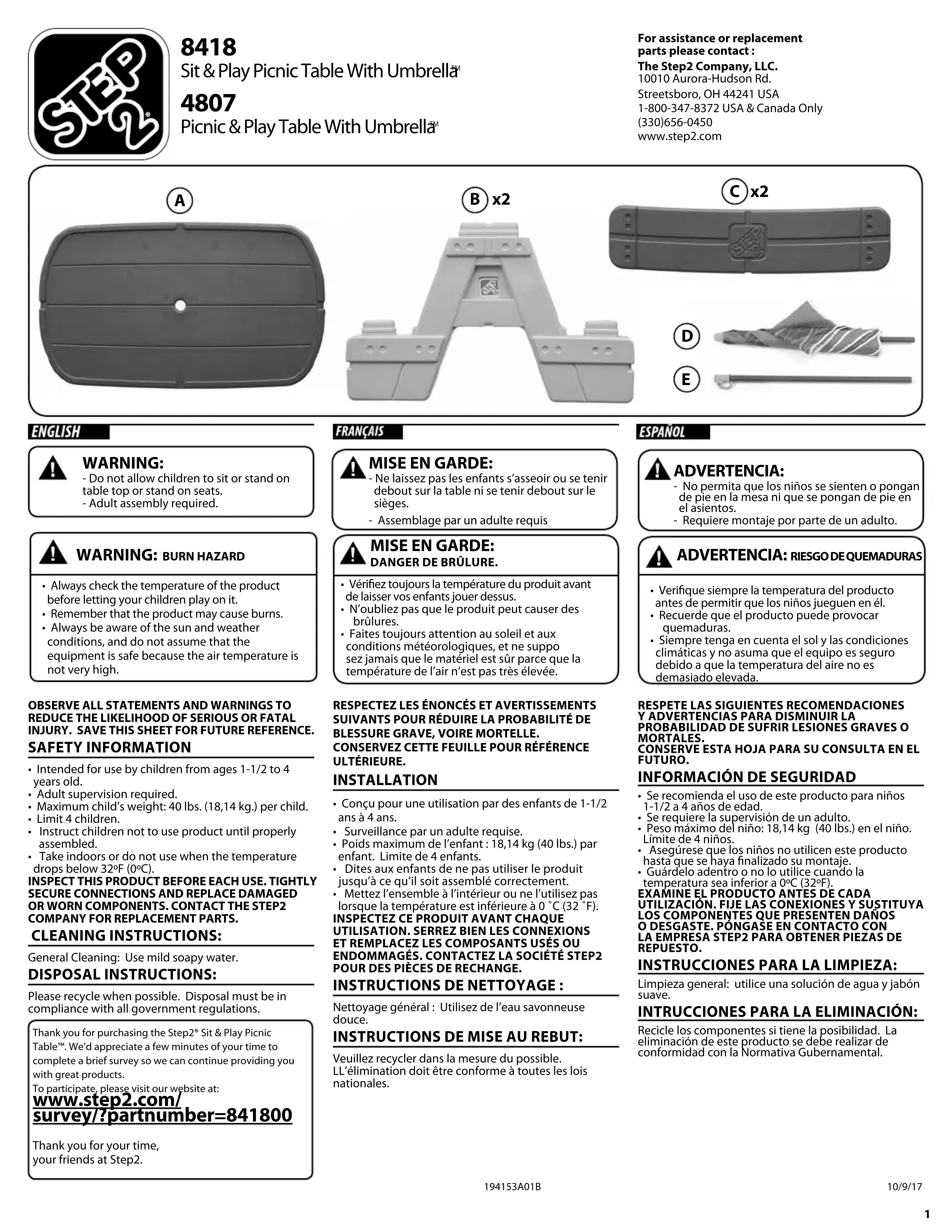 - Do not allow children to sit or stand on table top or stand on seats. - Adult assembly required.RESPECTEZ LES ÉNONCÉS ET AVERTISSEMENTS SUIVANTS POUR RÉDUIRE LA PROBABILITÉ DE BLESSURE GRAVE, VOIRE MORTELLE. CONSERVEZ CETTE FEUILLE POUR RÉFÉRENCE ULTÉRIEURE.INSTALLATION• Conçu pour une utilisation par des enfants de 1-1/2 ans à 4 ans. • Surveillance par un adulte requise. • Poids maximum de l’enfant : 18,14 kg (40 lbs.) par enfant. Limite de 4 enfants.• Dites aux enfants de ne pas utiliser le produit jusqu’à ce qu’il soit assemblé correctement.• Mettez l’ensemble à l’intérieur ou ne l’utilisez pas lorsque la température est inférieure à 0 ˚C (32 ˚F).INSPECTEZ CE PRODUIT AVANT CHAQUE UTILISATION. SERREZ BIEN LES CONNEXIONS ET REMPLACEZ LES COMPOSANTS USÉS OU ENDOMMAGÉS. CONTACTEZ LA SOCIÉTÉ STEP2 POUR DES PIÈCES DE RECHANGE.INSTRUCTIONS DE NETTOYAGE :Nettoyage général : Utilisez de l’eau savonneuse douce.INSTRUCTIONS DE MISE AU REBUT:Veuillez recycler dans la mesure du possible. LL’élimination doit être conforme à toutes les lois nationales. MISE EN GARDE: - Ne laissez pas les enfants s’asseoir ou se tenir debout sur la table ni se tenir debout sur le sièges. - Assemblage par un adulte requis194153A01B 10/9/17Thank you for purchasing the Step2® Sit & Play Picnic Table™. We’d appreciate a few minutes of your time to complete a brief survey so we can continue providing you with great products.To participate, please visit our website at: www.step2.com/ survey/?partnumber=841800 Thank you for your time,your friends at Step2.• Always check the temperature of the product before letting your children play on it.• Remember that the product may cause burns.• Always be aware of the sun and weather conditions, and do not assume that the equipment is safe because the air temperature is not very high.