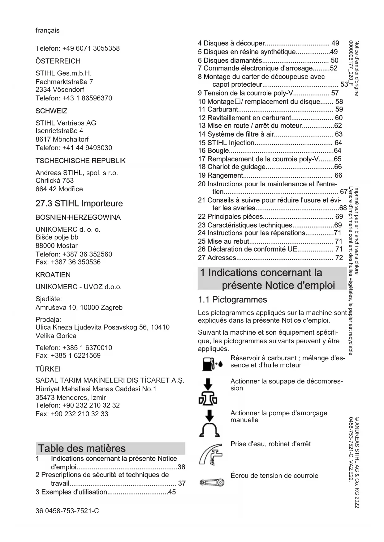 La philosophie de STIHL consiste à poursuivre le développement continu de toutes ses machines et de tous ses dispositifs ; c'est pourquoi nous devons nous réserver tout droit de modification de nos produits, en ce qui concerne la forme, la technique et les équipements. On ne pourra donc en aucun cas se prévaloir des indications et illustrations de la présente Notice d'emploi à l'appui de revendications quel‐ conques. 2 Prescriptions de sécurité et techniques de travail En travaillant avec la découpeuse à disque, il faut respecter des prescrip‐ tions de sécurité particulières, parce que le disque à découper tourne à une très haute vitesse. Avant la première mise en service, lire attentivement et intégralement la présente Notice d'emploi. La conser‐ ver précieusement pour pouvoir la relire lors d'une utilisation ultérieure. Le non-respect des consignes de sécurité peut entraîner un danger de mort. Respecter les prescriptions de sécurité nationa‐ les spécifiques publiées par ex. par les caisses professionnelles d'assurances mutuelles, cais‐ ses de sécurité sociale, services pour la protec‐ tion du travail et autres organismes compétents. Les employeurs des pays de l'Union Européenne doivent impérativement respecter la directive 2009/104/CE – Prescriptions minimales de sécu‐ rité et de santé pour l'utilisation par les travail‐ leurs au travail d'équipements de travail. Une personne qui travaille pour la première fois avec la machine doit demander au vendeur ou à une autre personne compétente de lui montrer comment l'utiliser en toute sécurité – ou partici‐ per à un stage de formation. Les jeunes encore mineurs ne sont pas autorisés à travailler avec cette machine – une seule exception est permise pour des apprentis de plus de 16 ans travaillant sous surveillance. Veiller à ce que des spectateurs éventuels, en particulier des enfants, ou des animaux restent à une distance suffisante. Lorsque la machine n'est pas utilisée, la ranger en veillant à ce qu'elle ne présente aucun danger pour d'autres personnes. Conserver la machine à un endroit adéquat, de telle sorte qu'elle ne puisse pas être utilisée sans autorisation. L'utilisateur est responsable des blessures qui pourraient être infligées à d'autres personnes, de même que des dégâts matériels causés à autrui. Ne confier la machine qu'à des personnes fami‐ liarisées avec ce modèle et sa manipulation – toujours y joindre la Notice d'emploi. L'utilisation de dispositifs à moteur bruyants peut être soumise à des prescriptions nationales ou locales précisant les créneaux horaires à respec‐ ter. L'utilisateur de la machine doit être reposé, en bonne santé et en bonne condition physique. Il est conseillé à toute personne qui ne doit pas se fatiguer pour des raisons de santé de consul‐ ter son médecin pour savoir si l’utilisation d’un dispositif à moteur ne présente aucun risque. Uniquement pour les personnes qui portent un stimulateur cardiaque : le système d'allumage de cette machine engendre un champ électroma‐ gnétique de très faible intensité. Une influence sur certains types de stimulateurs cardiaques ne peut pas être totalement exclue. Afin d'écarter tout risque pour la santé, STIHL recommande aux personnes portant un stimulateur cardiaque de consulter leur médecin traitant et le fabricant du stimulateur cardiaque. Il est interdit de travailler avec la machine après avoir consommé de l'alcool ou de la drogue ou bien après avoir pris des médicaments qui ris‐ quent d'affecter la réactivité. En présence de conditions météorologiques défavorables (pluie, neige, gel, vent), remettre le travail à plus tard – risque d’accident accru ! 2 Prescriptions de sécurité et techniques de travail français 0458-753-7521-C 37Cette machine est conçue exclusivement pour le découpage. Elle ne convient pas pour la coupe du bois ou d'objets en bois. La poussière d'amiante est extrêmement nocive – ne jamais découper de l'amiante ! L'utilisation de cette machine pour d'autres tra‐ vaux est interdite et pourrait provoquer des acci‐ dents ou endommager la machine. N'apporter aucune modification à cette machine – cela risquerait d'en compromettre la sécurité. STIHL décline toute responsabilité pour des blessures ou des dégâts matériels occasionnés en cas d'utilisation d'équipements rapportés non autorisés. Il faut exclusivement monter des disques à découper qui sont autorisés par STIHL pour cette machine ou alors des pièces technique‐ ment équivalentes. Pour toute question à ce sujet, s'adresser à un revendeur spécialisé. Utili‐ ser exclusivement des disques à découper ou des accessoires de haute qualité. Sinon, des accidents pourraient survenir ou la machine ris‐ querait d'être endommagée. STIHL recommande d’utiliser des disques à découper et des accessoires d'origine STIHL. Leurs caractéristiques sont optimisées tout spé‐ cialement pour ce produit, compte tenu des exi‐ gences de l'utilisateur. Pour le nettoyage de cette machine, ne pas utili‐ ser un nettoyeur haute pression. Le puissant jet d'eau risquerait d'endommager certaines pièces de la machine. Ne pas nettoyer la machine au jet d'eau. Ne jamais utiliser des scies circulai‐ res, des outils à plaquettes de car‐ bure, des outils de désincarcération ou des outils pour le sciage du bois, ni tout autre outil denté – risque de blessures mortelles !Contrairement aux disques à découper qui tournent régulièrement en enlevant des parti‐ cules, les dents d'une scie circulaire en rotation peuvent s'accrocher dans la matière à couper. Cela se mani‐ feste par une coupe saccadée et peut provoquer des réactions incontrôlées de la machine, engendrant des forces de réaction extrêmement dangereu‐ ses (rebond).