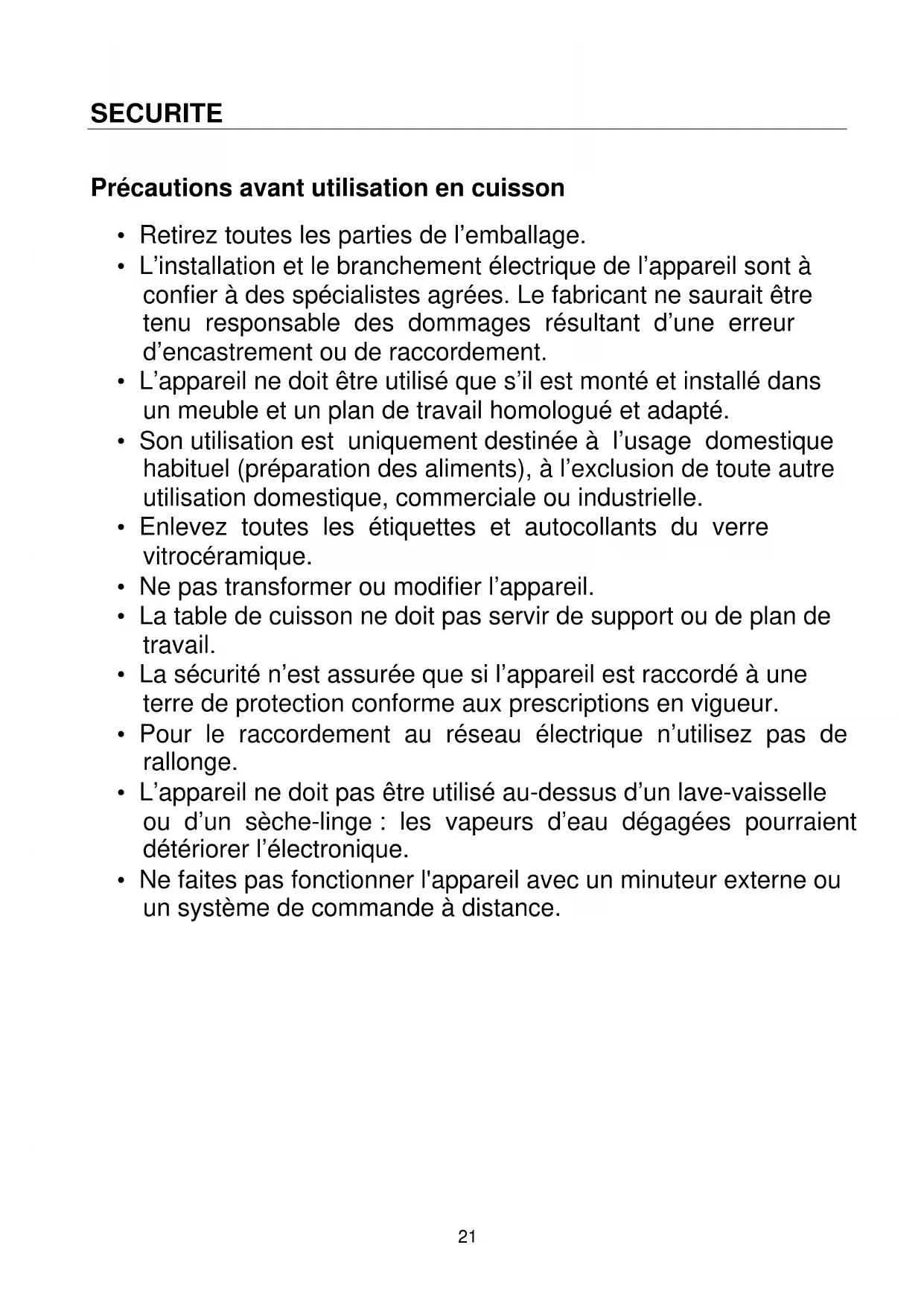 - En cas de fêlure ou de fissure de la vitrocéramique il faut impérativement débrancher l’appareil du réseau électrique et prévenir le service après-vente.