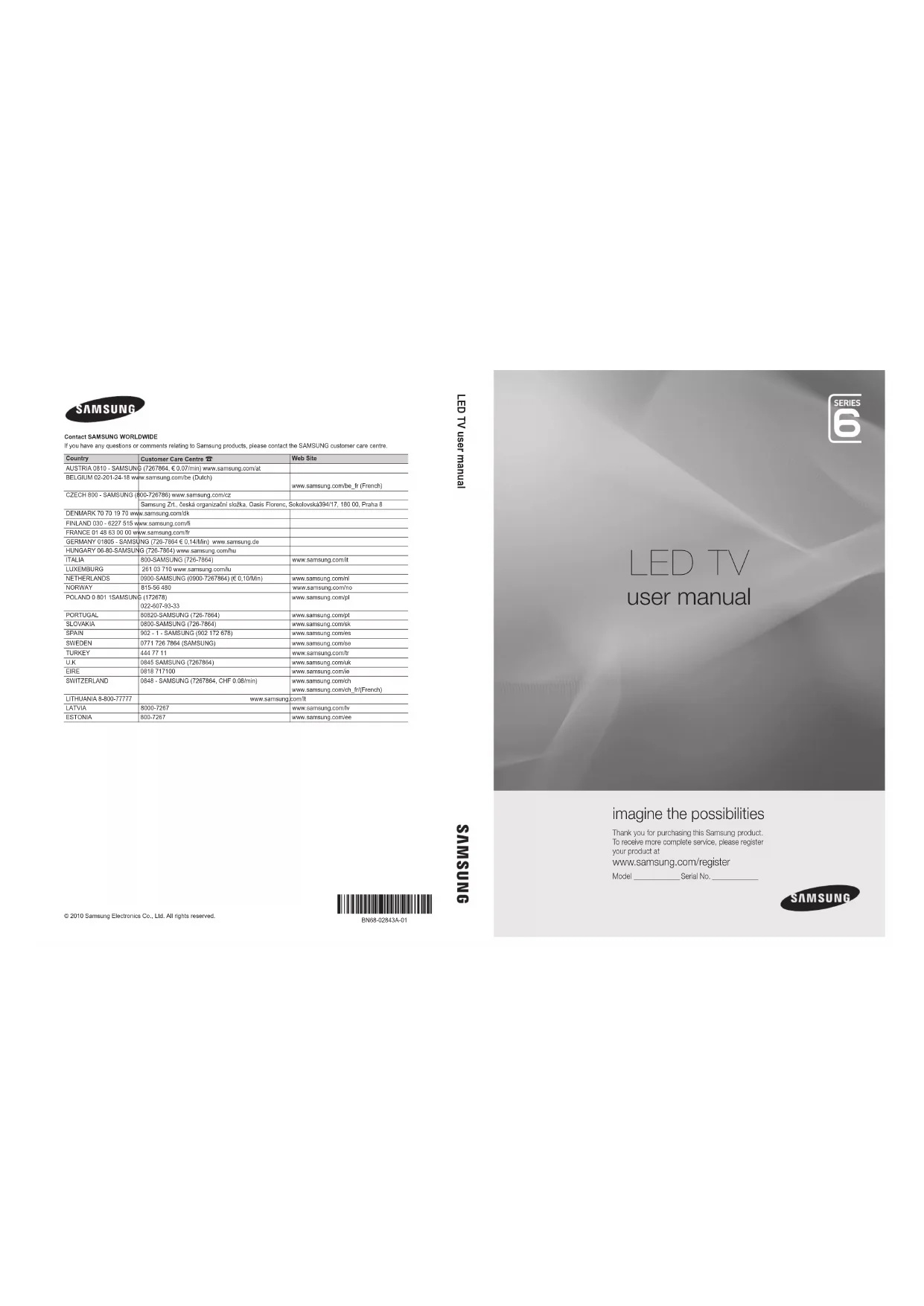 Wall Mount 54 Warm 19 White Balance 18 [UC6900_XC]BN68-02843A-01L06.indb 62 2010-08-06 오후 2:01:10This page is intentionally left blank. [UC6900_XC]BN68-02843A-01L06.indb 63 2010-08-06 오후 2:01:102 Français Les figures et illustrations contenues dans ce mode d'emploi sont fournies pour référence uniquement. Elles peuvent différer de l'aspect réel du produit. La conception et les spécifications du produit sont susceptibles d'être modifiées sans préavis. Avis concernant le téléviseur numérique 1. Les fonctions relatives à la télévision numérique (DVB) ne sont disponibles que dans les pays ou régions où des signaux terrestres numériques de type DVB-T (MPEG2 et MPEG4 AVC) sont diffusés ou dans lesquels vous avez accès à un service de télévision par câble compatible DVB-C (MPEG2 et MPEG4 AAC). Consultez votre distributeur local pour connaître les possibilités en matière de réception des signaux DVB-T ou DVB-C. 2. DVB-T est la norme du consortium européen DVB pour la diffusion de signaux terrestres de télévision numérique. La norme DVB-C est, quant à elle, prévue pour la diffusion des signaux de télévision numérique par câble. Certaines fonctions particulières, telles que le guide électronique des programmes (Electric Program Guide - EPG) ou encore la vidéo à la demande (Video On Demand - VOD), ne sont toutefois pas incluses dans cette spécification. Dès lors, elles ne seront pas traitées pour l'instant. 3. Bien que ce téléviseur soit conforme aux dernières normes DVB-T et DVB-C (août 2008), il n'est pas garanti qu'il soit compatible avec les futures diffusions de signaux numériques terrestres DVB-T et par câble DVB-C. 4. En fonction du pays ou de la région où vous vous trouvez, certains opérateurs de télévision par câble peuvent facturer des frais supplémentaires pour un tel service. Il se peut également que vous deviez accepter les termes et conditions de ces sociétés. 5. Il se peut que certaines fonctions de TV numérique ne soient pas disponibles dans certains pays ou certaines régions et que la réception des signaux DVB-C ne soit pas correcte avec tous les opérateurs.