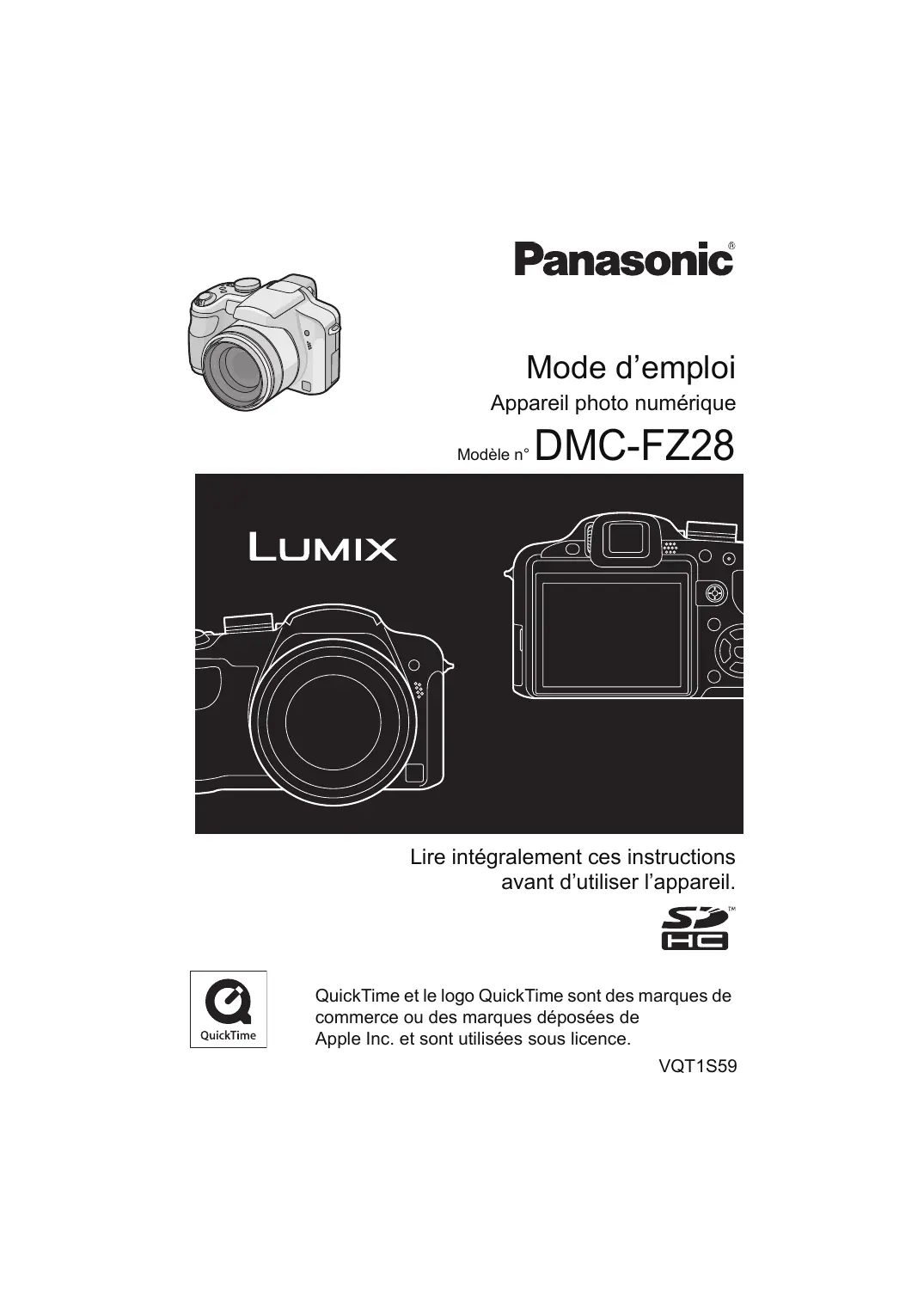 Mode d’emploi Appareil photo numérique Modèle n° DMC-FZ28 Lire intégralement ces instructions avant d’utiliser l’appareil. QuickTime et le logo QuickTime sont des marques de commerce ou des marques déposées de Apple Inc. et sont utilisées sous licence. VQT1S59 Avant utilisation À notre clientèle, Nous vous remercions d’avoir choisi un appareil photo numérique Panasonic. Veuillez lire attentivement ce manuel et le conserver à portée de main pour vous y référer chaque fois que vous en aurez besoin. Avant utilisation Précautions à prendre