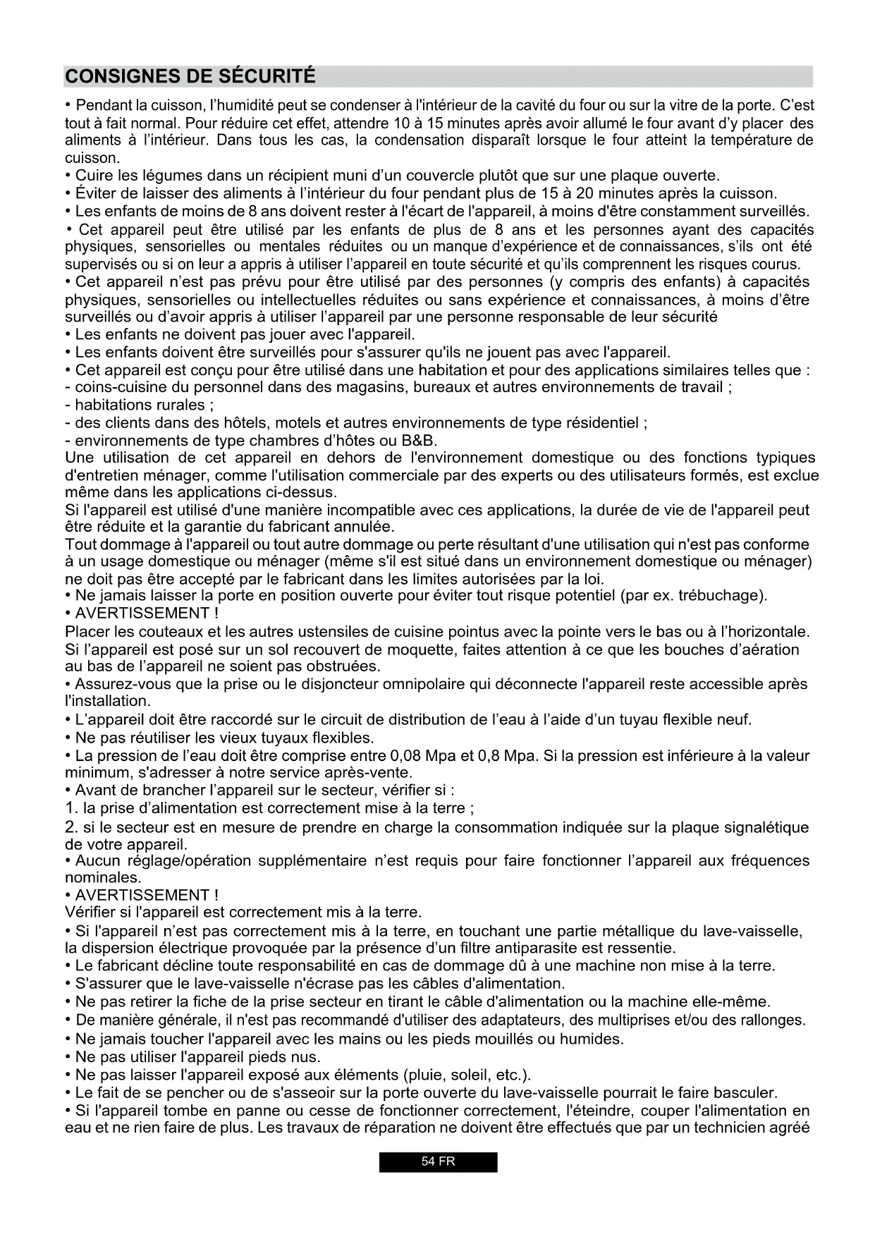 - Si l'appareil tombe en panne ou cesse de fonctionner correctement, l'éteindre, couper l'alimentation en eau et ne rien faire de plus. Les travaux de réparation ne doivent être effectués que par un technicien agrééCONSIGNES DE SÉCURITÉ 55 FR et seules les pièces détachées authentiques doivent être installées. Tout non-respect des conseils ci- dessus peut avoir de graves conséquences sur la sécurité de l'appareil.