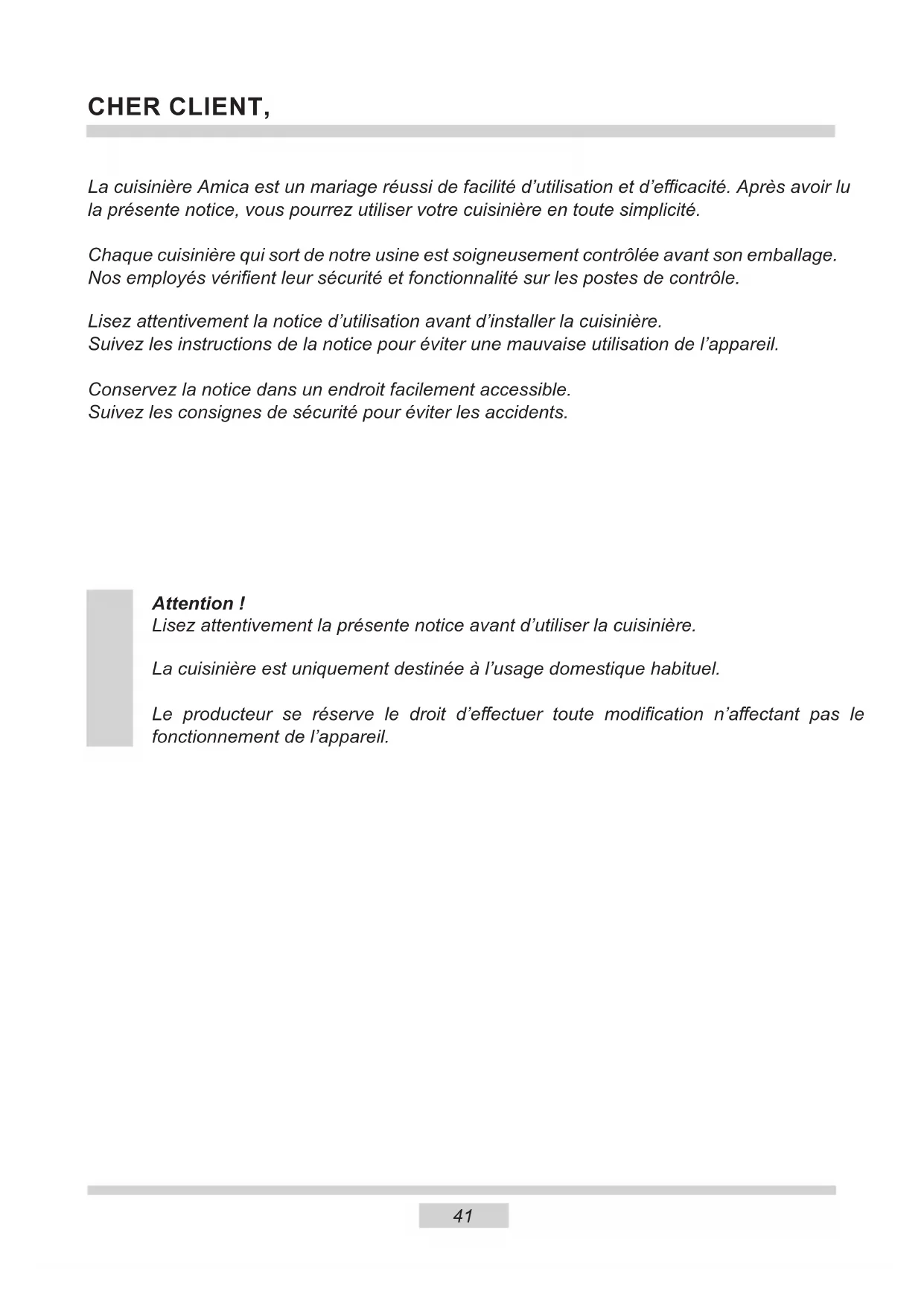 Faites particulièrement attention aux enfants qui sont à proximité de la cuisinière. Ne touchez pas l’appareil en fonctionnement pour éviter des brûlures ! En branchant les appareils électriques sur une prise de courant située à proximité, assurez-vous que leurs éléments ou le câble d’alimentation ne soient pas en contact avec le four ou la plaque en fonctionnement car l’isolation de ces appareils ne protège pas contre les hautes températures. Les cuissons doivent être réalisées sous votre surveillance. Les huiles et les matières grasses peuvent prendre feu suite au surchauage ou débordement. Il faut empêcher que la table de cuisson devienne sale. Ce point concerne en particulier le sucre qui réagit avec la plaque vitrocéramique et peut l’endom- mager dénitivement. Il est nécessaire d’enlever les taches éventuelles au fur et à mesure. Il est interdit de mettre des récipients avec le fond mouillé sur les foyers chauds ; cela risque d’endommager dénitivement l’appareil (taches indélébiles). Les récipients utilisés doivent être conçus pour la plaque céramique. Si vous constatez que la plaque céramique est endommagée, qu’elle présente des rayures profondes, des ssures ou des éclats, arrêtez d’utiliser l’appareil et avertissez un point de Service Après Vente. Avant de mettre les foyers en fonctionnement, mettez des récipients dessus. Il est interdit d’utiliser les récipients à arêtes vives qui risquent d’endommager la plaque céramique. Ne regardez pas xement les foyers halogènes en fonctionnement (sans récipient dessus). Ne posez pas de récipients dont le poids dépasse 15 kg sur la porte ouverte du four ni de récipients dont le poids dépasse 25 kg – sur la vitrocéramique. Évitez d’utiliser des poudres de nettoyage ou une éponge abrasive pour nettoyer la vitre de la porte ; cela risquerait de rayer la surface provoquant les ssures du verre. Il est interdit d’utiliser la cuisinière dont le fonctionnement technique est incorrect. Toutes les réparations doivent être eectuées par des personnes ayant des qua- lications adéquates. En cas de détection d’une défaillance technique, il faut débrancher obligatoirement l’appareil et avertir un point de Service Après Vente. Suivez obligatoirement les consignes et les prescriptions incluses dans la notice. Les personnes qui n’ont pas lu la notice ne peuvent pas utiliser la cuisinière. L’appareil a été conçu uniquement en tant que l’appareil destiné à la cuisson. Toute une autre utilisation (par exemple pour le chauage d’ambiances) est contraire à sa destination et peut être dangereuse.45 Utilisez la chaleur accumulée du four. Si le temps de préparation dépasse 40 mi- nutes, il faut éteindre le four 10 minutes avant la n de cuisson. Pour les grillades, utilisez une chaleur tournante et fermez la porte du four. Veillez à bien fermer la porte du four. Les salissures sur les joints de la porte font perdre la chaleur. Il est recommandé de les éliminer immédiatement. Évitez d’encastrer la cuisinière à proxi- mité des réfrigérateurs/congélateurs. Vous risquez de faire augmenter la consom- mation de l’énergie. L’utilisation responsable de l’énergie apporte non seulement des économies au budget du ménage mais permet aussi de préser- ver l’environnement. C’est pourquoi, il est important d’économiser l’énergie électrique. Comment utiliser économiquement la cuisinière : Utilisez des récipients appropriés. Les récipients à fond plat permettent d’écono- miser jusqu’à 1/3 d’énergie électrique. Mettez le couvercle, sans quoi la consommation d’énergie est quatre fois plus grande ! Utilisez les casseroles dont le diamètre du fond correspond aux surfaces chauf- fantes. Évitez d’utiliser des récipients plus petits. Veillez à la propreté des surfaces chauf- fantes et des fonds de casseroles. Les surfaces sales perturbent le passage de la chaleur ; certaines brûlures ne peuvent être éliminées qu’à l’aide des produits de nettoyage polluants. Évitez d’enlever le couvercle, si cela n’est pas nécessaire. Évitez d’ouvrir la porte du four, si cela n’est pas nécessaire. Éteignez les foyers avant la n de la cuis- son pour utiliser la chaleur résiduelle. Si le temps de la cuisson est long, étei- gnez les foyers 5–10 minutes avant la n de la cuisson. Ceci permet d’économiser jusqu’à 20 % d’énergie. Utilisez le four pour préparer des quan- tités de plats assez grandes. Pour préparer 1 kg de viande, utilisez plutôt la vitrocéramique ; ceci est plus économique.