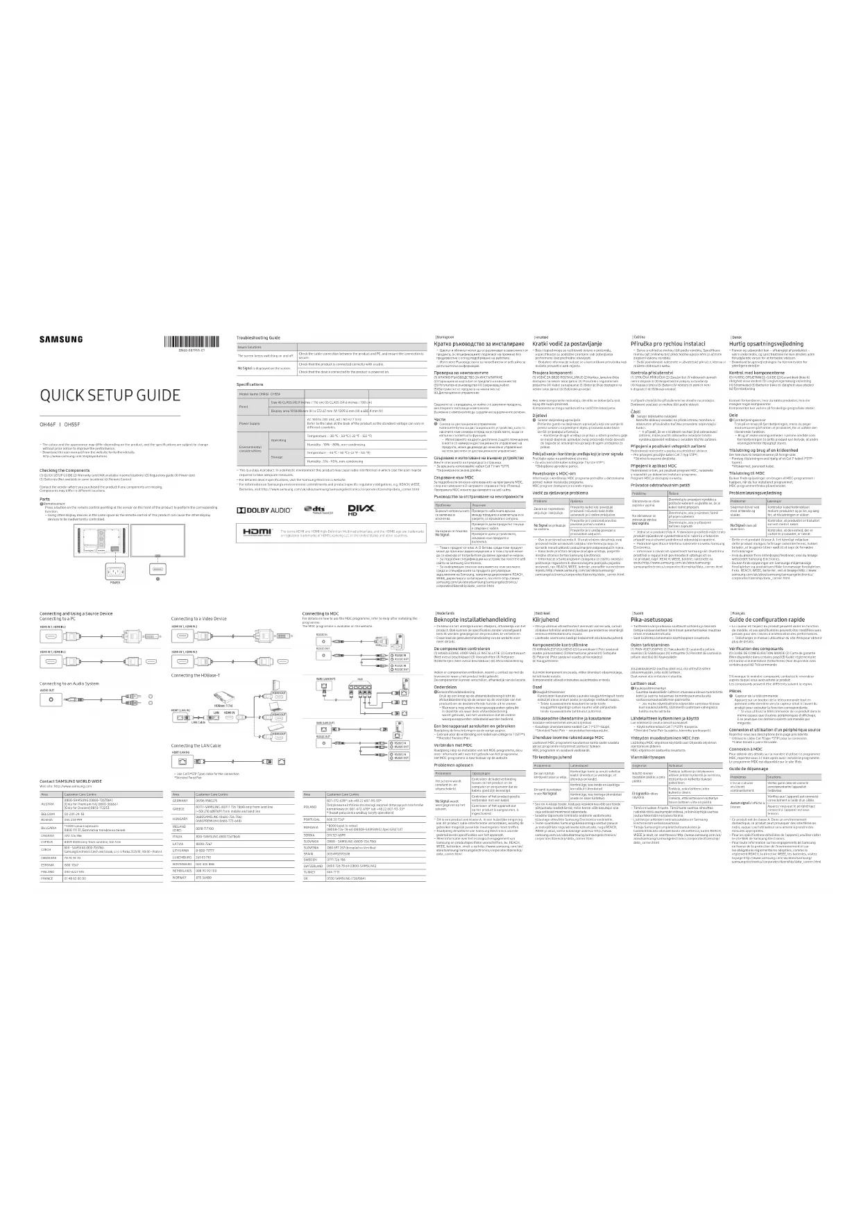 Capteur de la télécommande Appuyez sur un bouton de la télécommande tout en pointant cette dernière vers le capteur situé à l'avant du produit pour exécuter la fonction correspondante. − Si vous utilisez la télécommande de ce produit dans le même espace que d'autres périphériques d'affichage, il se peut que ces derniers soient commandés par mégarde. Connexion et utilisation d'un périphérique source Reportez-vous aux descriptions de la page précédente. − Utilisez le câble Cat 7(type *STP) pour la connexion. *Câble blindé à paire torsadée. Connexion à MDC Pour obtenir des détails sur la manière d'utiliser le programme MDC, reportez-vous à l'Aide après avoir installé le programme. Le programme MDC est disponible sur le site Web. Guide de dépannage Problèmes Solutions L'écran s'allume et s'éteint continuellement. Vérifiez que le câble est connecté correctement entre l'appareil et l'ordinateur. Aucun signal s'affiche à l'écran. Vérifiez que l'appareil est connecté correctement à l'aide d'un câble. Assurez-vous que le périphérique connecté à l'appareil est sous tension. − Ce produit est de classe A. Dans un environnement domestique, ce produit peut provoquer des interférences radio, auquel cas l’utilisateur sera amené à prendre des mesures appropriées. − Pour les spécifications détaillées de l'appareil, veuillez visiter le site Web de Samsung Electronics. − Pour toute information sur les engagements de Samsung en faveur de la protection de l’environnement et sur les obligations réglementaires adoptées, comme le règlement REACH, la directive WEEE, les batteries, visitez la page http://www.samsung.com/uk/aboutsamsung/ samsungelectronics/corporatecitizenship/data_corner.html Contact SAMSUNG WORLD WIDE Web site: http://www.samsung.com OH46F І OH55F
