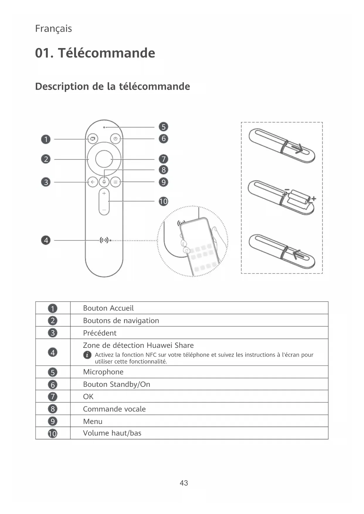 toute utilisation de ces marques par Huawei Technologies Co., Ltd. se fait sous licence. Huawei Device Co., Ltd. est une société aliée à Huawei Technologies Co., Ltd. Les termes HDMI et HDMI, High-Denition Multimedia Interface, et le logo HDMI sont des marques commerciales ou des marques déposées de HDMI Licensing Administrator, Inc. aux États-Unis et dans d'autres pays. Protection de la vie privée Pour mieux comprendre comment nous protégeons vos informations personnelles, veuillez consulter la politique relative à la vie privée à l'adresse suivante https://consumer.huawei.com/privacy-policy. En savoir plus Pour connaître l'adresse e-mail et le numéro de téléphone à jour du support clientèle de votre pays ou région, allez sur https://consumer.huawei.com/en/support/hotline. Toutes les images et illustrations contenues dans ce document ne sont données qu'à titre de référence. Le produit et l'écran réels peuvent diérer.51 Polski Wygląd pilota