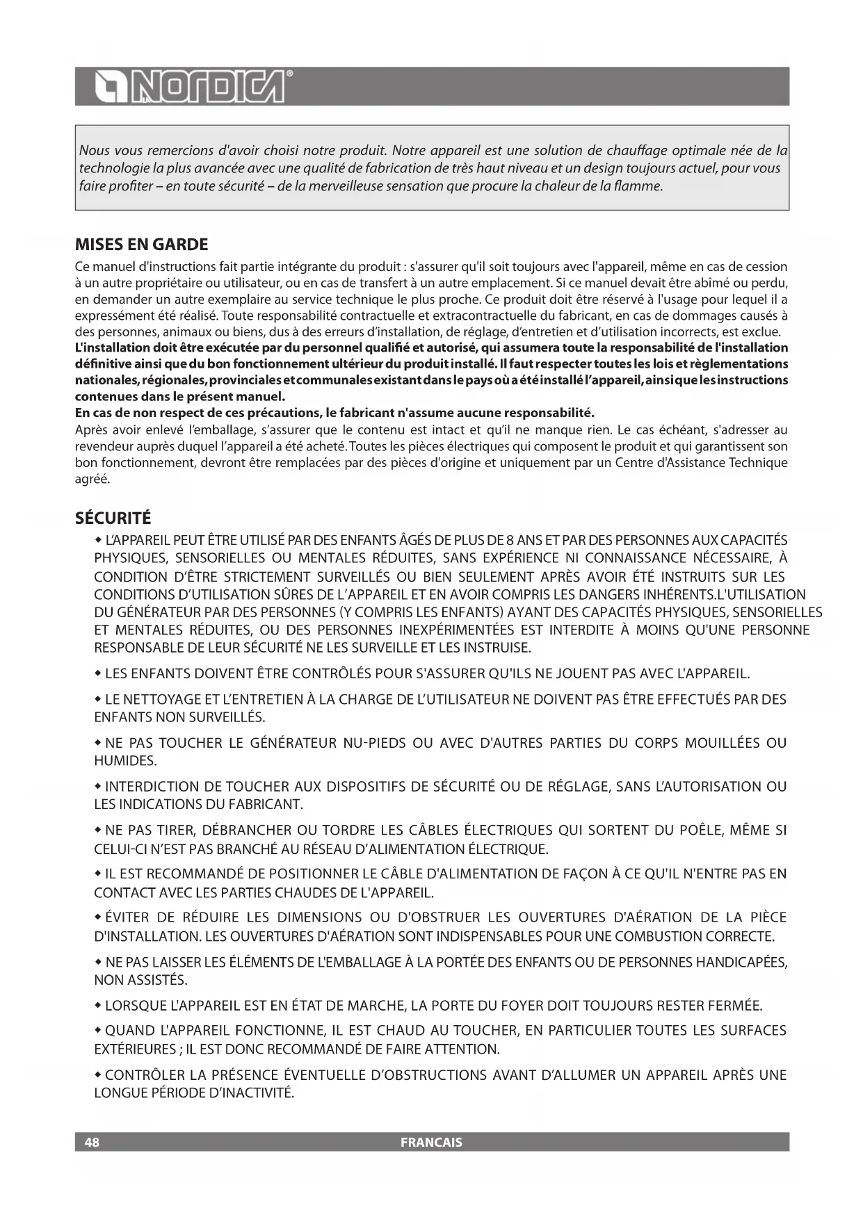 Ce manuel d'instructions fait partie intégrante du produit: s'assurer qu'il soit toujours avec l'appareil, même en cas de cession à un autre propriétaire ou utilisateur, ou en cas de transfert à un autre emplacement. Si ce manuel devait être abîmé ou perdu, en demander un autre exemplaire au service technique le plus proche. Ce produit doit être réservé à l'usage pour lequel il a expressément été réalisé. Toute responsabilité contractuelle et extracontractuelle du fabricant, en cas de dommages causés à des personnes, animaux ou biens, dus à des erreurs d’installation, de réglage, d’entretien et d’utilisation incorrects, est exclue. L'installation doit être exécutée par du personnel qualié et autorisé, qui assumera toute la responsabilité de l'installation dénitive ainsi que du bon fonctionnement ultérieur du produit installé. Il faut respecter toutes les lois et règlementations nationales, régionales, provinciales et communales existant dans le pays où a été installé l’appareil, ainsi que les instructions contenues dans le présent manuel. En cas de non respect de ces précautions, le fabricant n'assume aucune responsabilité. Après avoir enlevé l’emballage, s’assurer que le contenu est intact et qu’il ne manque rien. Le cas échéant, s'adresser au revendeur auprès duquel l’appareil a été acheté. Toutes les pièces électriques qui composent le produit et qui garantissent son bon fonctionnement, devront être remplacées par des pièces d'origine et uniquement par un Centre d'Assistance Technique agréé. SÉCURITÉ L’APPAREIL PEUT ÊTRE UTILISÉ PAR DES ENFANTS ÂGÉS DE PLUS DE 8 ANS ET PAR DES PERSONNES AUX CAPACITÉS PHYSIQUES, SENSORIELLES OU MENTALES RÉDUITES, SANS EXPÉRIENCE NI CONNAISSANCE NÉCESSAIRE, À CONDITION D’ÊTRE STRICTEMENT SURVEILLÉS OU BIEN SEULEMENT APRÈS AVOIR ÉTÉ INSTRUITS SUR LES CONDITIONS D’UTILISATION SÛRES DE L’APPAREIL ET EN AVOIR COMPRIS LES DANGERS INHÉRENTS.L'UTILISATION DU GÉNÉRATEUR PAR DES PERSONNES Y COMPRIS LES ENFANTS AYANT DES CAPACITÉS PHYSIQUES, SENSORIELLES ET MENTALES RÉDUITES, OU DES PERSONNES INEXPÉRIMENTÉES EST INTERDITE À MOINS QU'UNE PERSONNE RESPONSABLE DE LEUR SÉCURITÉ NE LES SURVEILLE ET LES INSTRUISE. LES ENFANTS DOIVENT ÊTRE CONTRÔLÉS POUR S'ASSURER QU'ILS NE JOUENT PAS AVEC L'APPAREIL. LE NETTOYAGE ET L’ENTRETIEN À LA CHARGE DE L’UTILISATEUR NE DOIVENT PAS ÊTRE EFFECTUÉS PAR DES ENFANTS NON SURVEILLÉS. NE PAS TOUCHER LE GÉNÉRATEUR NUPIEDS OU AVEC D'AUTRES PARTIES DU CORPS MOUILLÉES OU HUMIDES. INTERDICTION DE TOUCHER AUX DISPOSITIFS DE SÉCURITÉ OU DE RÉGLAGE, SANS L’AUTORISATION OU LES INDICATIONS DU FABRICANT. NE PAS TIRER, DÉBRANCHER OU TORDRE LES CÂBLES ÉLECTRIQUES QUI SORTENT DU POÊLE, MÊME SI CELUICI N’EST PAS BRANCHÉ AU RÉSEAU D’ALIMENTATION ÉLECTRIQUE. IL EST RECOMMANDÉ DE POSITIONNER LE CÂBLE D'ALIMENTATION DE FAÇON À CE QU'IL N'ENTRE PAS EN CONTACT AVEC LES PARTIES CHAUDES DE L'APPAREIL. ÉVITER DE RÉDUIRE LES DIMENSIONS OU D'OBSTRUER LES OUVERTURES D'AÉRATION DE LA PIÈCE D'INSTALLATION. LES OUVERTURES D'AÉRATION SONT INDISPENSABLES POUR UNE COMBUSTION CORRECTE. NE PAS LAISSER LES ÉLÉMENTS DE L'EMBALLAGE À LA PORTÉE DES ENFANTS OU DE PERSONNES HANDICAPÉES, NON ASSISTÉS. LORSQUE L'APPAREIL EST EN ÉTAT DE MARCHE, LA PORTE DU FOYER DOIT TOUJOURS RESTER FERMÉE. QUAND L'APPAREIL FONCTIONNE, IL EST CHAUD AU TOUCHER, EN PARTICULIER TOUTES LES SURFACES EXTÉRIEURES; IL EST DONC RECOMMANDÉ DE FAIRE ATTENTION. CONTRÔLER LA PRÉSENCE ÉVENTUELLE D’OBSTRUCTIONS AVANT D’ALLUMER UN APPAREIL APRÈS UNE LONGUE PÉRIODE D’INACTIVITÉ. 48FRANCAIS LE GÉNÉRATEUR A ÉTÉ CONÇU POUR ÊTRE UTILISÉ DANS N’IMPORTE QUELLE CONDITION CLIMATIQUE. CEPENDANT, EN CAS DE CLIMAT PARTICULIÈREMENT DÉFAVORABLE VENT FORT, GEL, LES SYSTÈMES DE SÉCURITÉ POURRAIENT SE DÉCLENCHER, PROVOQUANT AINSI L’ARRÊT DU GÉNÉRATEUR. SI CELA SE VÉRIFIE, CONTACTER LE SERVICE D’ASSISTANCE TECHNIQUE ET SURTOUT NE PAS DÉSACTIVER LES SYSTÈMES DE SÉCURITÉ. EN CAS D'INCENDIE DU CONDUIT DE FUMÉE, SE MUNIR D'EXTINCTEURS POUR ÉTOUFFER LES FLAMMES OU APPELER LES POMPIERS. CET APPAREIL NE DOIT PAS ÊTRE UTILISÉ COMME INCINÉRATEUR DE DÉCHETS.