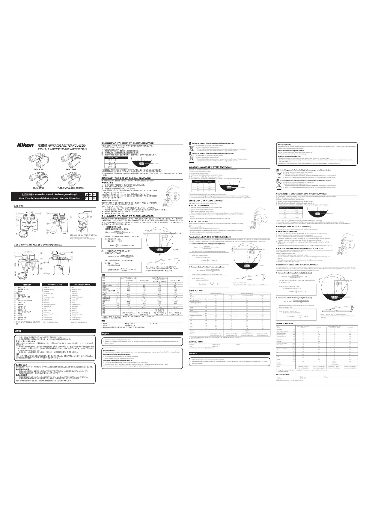 CARACTÉRISTIQUES Type À prisme de Porro et mise au point individuelleÀ prisme de Porro et mise au point centrale Modèle 7×50 IF WP 7×50 CF WP 7×50 CF WP GLOBAL COMPASS 10×50 CF WP Grossissement (×) 7 7 7 10 Diamètre effectif de l'objectif (mm) 50 50 50 50 Champ de vision angulaire (réel) (°) 7,5 7,2 7,2 6,2 Champ de vision angulaire (apparent) (°)* 49,3 47,5 47,5 56,9 Champ de vision à 1000 (m/yards) (m) 131 126 126 108 (pieds) 393 377 377 325 Pupille de sortie (mm) 7,1 7,1 7,1 5,0 Luminosité 50,4 50,4 50,4 25,0 Dégagement oculaire (mm) 15,0 22,7 22,7 17,4 Distance minimale de mise au point (m)** 25 10 10 17 (pieds)** 82,0 32,8 32,8 55,8 Réglage de la distance interpupillaire (mm) 59-72 56-72 56-72 56-72 Longueur (mm) 178 193 193 190 (pouces) 7,0 7,6 7,6 7,5 Largeur (mm) 203 202 202 202 (pouces) 8,0 8,0 8,0 8,0 Profondeur (mm) 70 71 81 71 (pouces) 2,8 2,8 3,2 2,8 Poids (oz) 39,3 39,3 39,9 37,7 (g) 1 115 1 115 1 130 1 070 Conformité– –RoHs, WEEE Alimentation– –Deux piles LR43 Structure Étanche à l'eau (jusqu'à 2mètre pendant 5minutes) et remplie d'azoteÉtanche à l'eau (jusqu'à 1mètre pendant 5minutes) et remplie d'azoteÉtanche à l'eau (jusqu'à 1mètre pendant 5minutes) et remplie d'azoteÉtanche à l'eau (jusqu'à 1mètre pendant 5minutes) et remplie d'azote