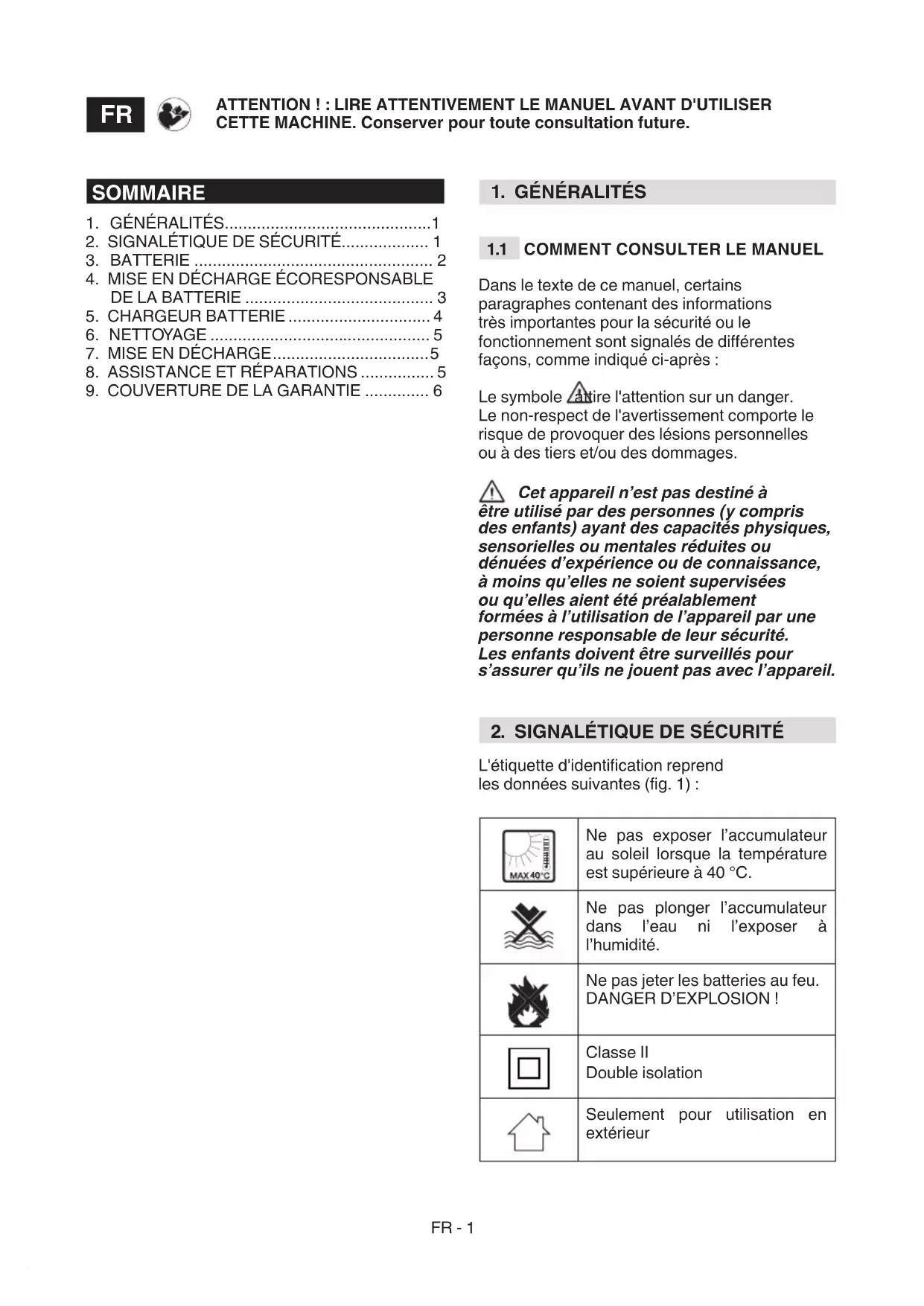 Ne pas exposer l’accumulateur au soleil lorsque la température est supérieure à 40 °C. Ne pas plonger l’accumulateur dans l’eau ni l’exposer à l’humidité. Ne pas jeter les batteries au feu. DANGER D’EXPLOSION ! Classe II Double isolation Seulement pour utilisation en extérieur ATTENTION ! : LIRE ATTENTIVEMENT LE MANUEL AVANT D'UTILISER CETTE MACHINE. Conserver pour toute consultation future.