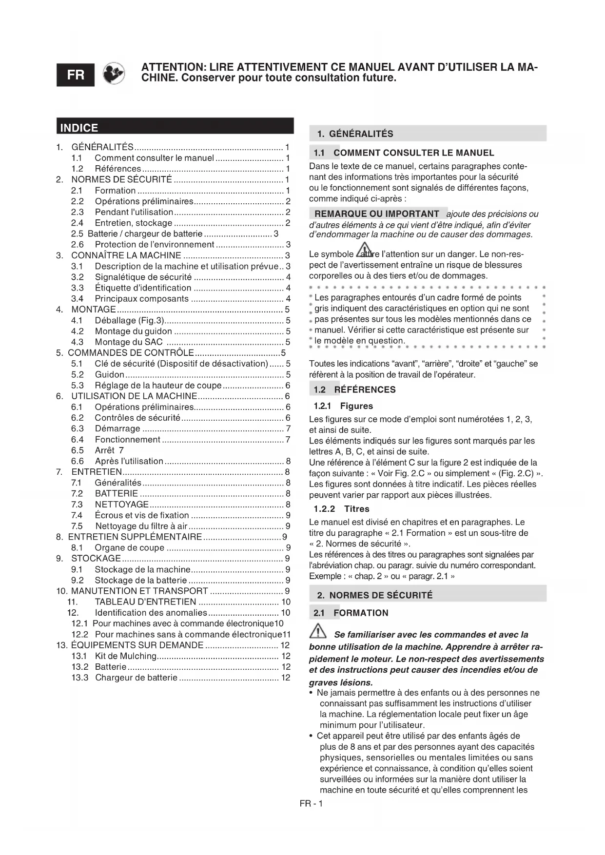 IMPORTANT Les normes de sécurité suivantes com- plètent les prescriptions de sécurité gurant dans la notice de la batterie et du chargeur de batterie jointe à la machine.