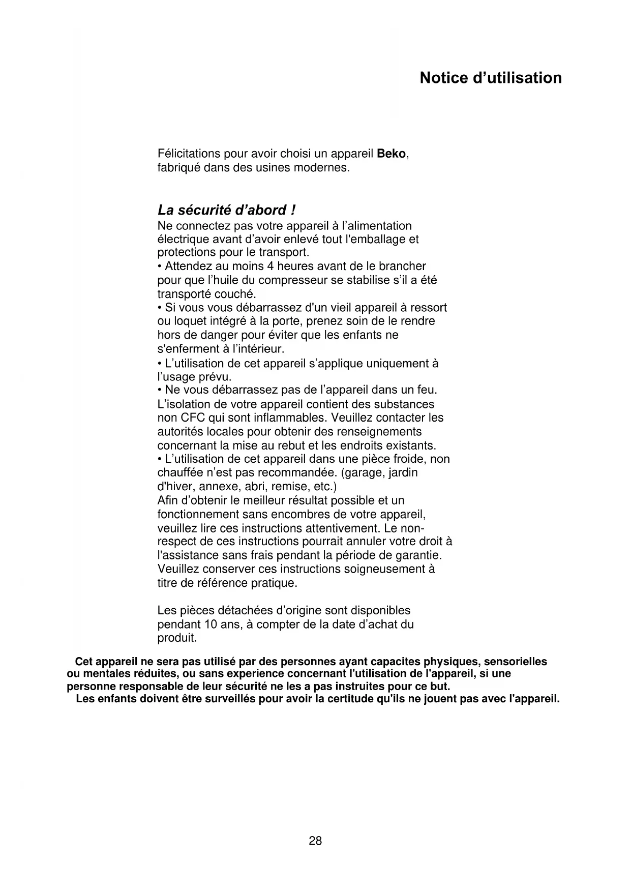 Cet appareil ne sera pas utilisé par des personnes ayant capacites physiques, sensorielles ou mentales réduites, ou sans experience concernant l'utilisation de l'appareil, si une personne responsable de leur sécurité ne les a pas instruites pour ce but. Les enfants doivent être surveillés pour avoir la certitude qu'ils ne jouent pas avec l'appareil.FR Notice d’utilisation Conditions électriques Avant de brancher l'appareil à la prise murale, vérifiez que la tension et la fréquence indiquées sur la plaque signalétique à l'intérieur de l'appareil correspondent à votre alimentation électrique. La prise doit être accessible après l'installation afin de permettre le débranchement de l'appareil du secteur. Avertissement ! Cet appareil doit être branché à une borne de mise à la terre. Les réparations de l'appareillage électrique doivent être réalisées par des techniciens qualifiés. Si le câble d’alimentation est endommagé, il doit être remplacé par le constructeur ou le service clientèle afin d’écarter tout danger. ATTENTION ! Cet appareil fonctionne avec du R600a, un gaz qui contribue à la protection de l’environnement mais qui est inflammable. Pendant le transport et l’installation du produit, veillez à ne pas endommager le système réfrigérant. Si le système réfrigérant est abîmé et qu’une fuite de gaz se produit, tenez l’appareil à l’écart des sources de flammes vives et aérer bien la pièce. AVERTISSEMENT - N’utilisez pas d'outils mécaniques ou autres moyens pour accélérer le processus de décongélation autres que ceux qui sont recommandés par le fabricant. AVERTISSEMENT- N’abîmez pas le circuit réfrigérant. AVERTISSEMENT- Ne faites pas fonctionner d'appareils électriques à l'intérieur des compartiments de conservation de aliments, à moins qu’ils soient conformes au type d'appareils recommandés par le fabricant. AVERTISSEMENT- Si le cordon d’alimentation est endommagé, celui-ci doit être remplacé par le fabricant, ses agents agréés ou tout autre agent qualifié afin d'être à l'abri de tout danger. Instructions de transport