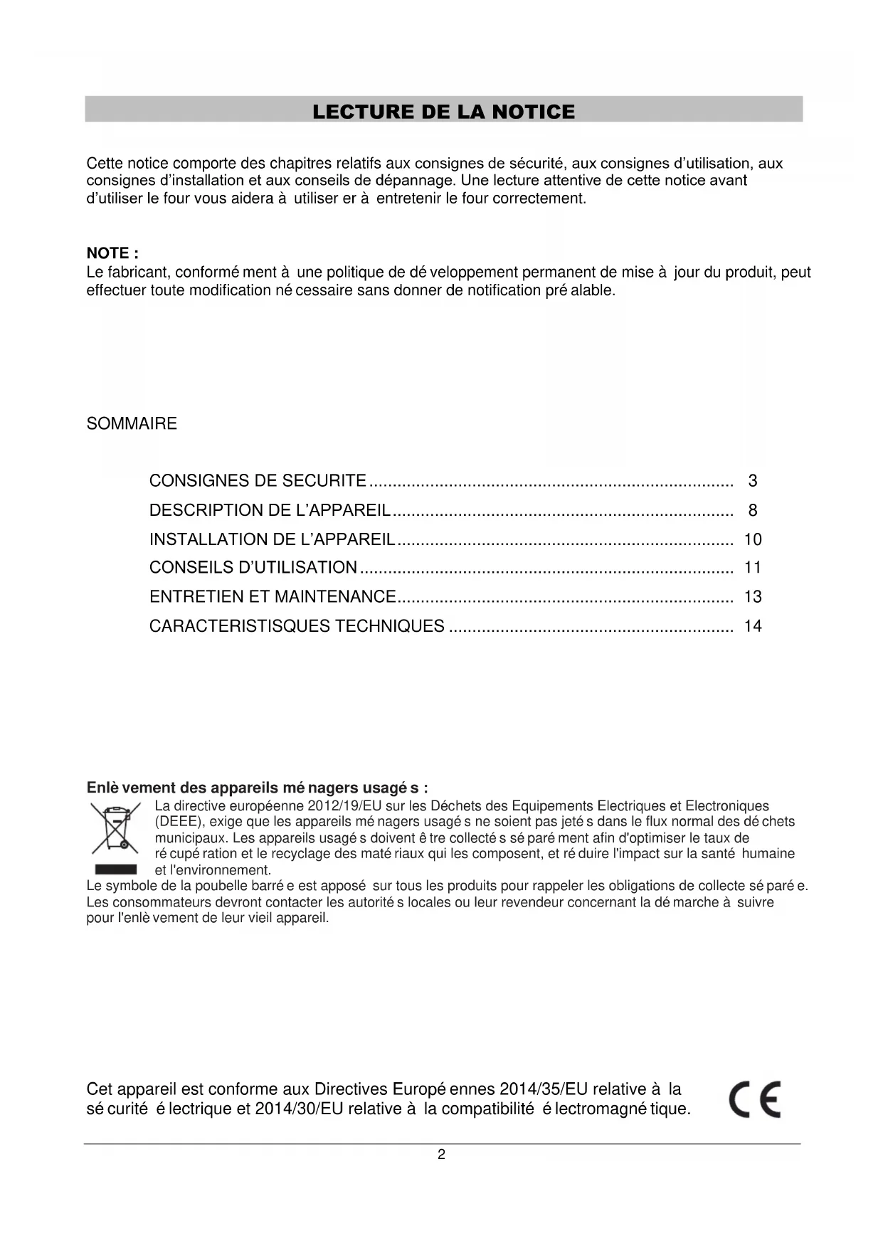 Cette notice comporte des chapitres relatifs aux consignes de sécurité, aux consignes d’utilisation, aux consignes d’installation et aux conseils de dépannage. Une lecture attentive de cette notice avant d’utiliser le four vous aidera à utiliser er à entretenir le four correctement.