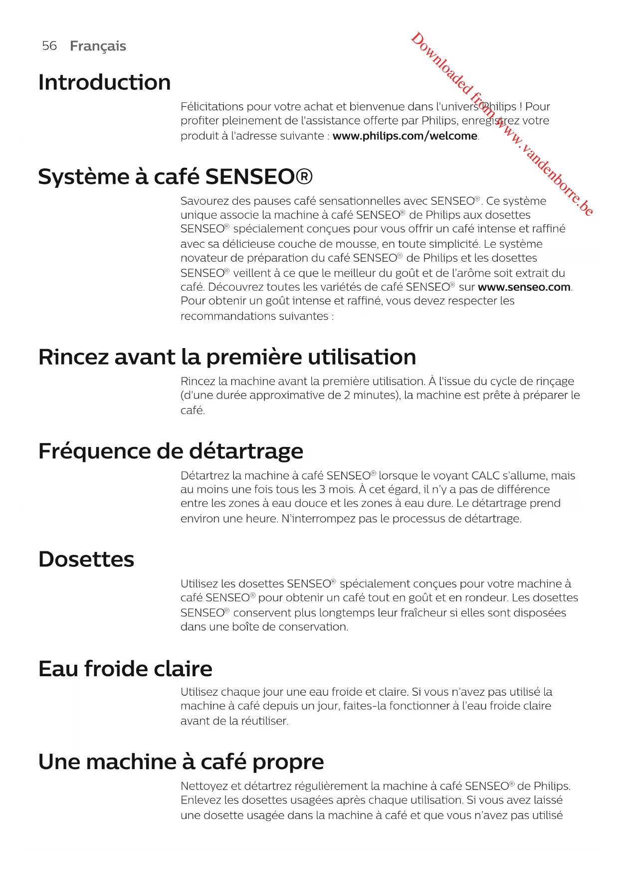 Deutsch Downloaded from www.vandenborre.beFrançais Introduction Félicitations pour votre achat et bienvenue dans l'univers Philips! Pour profiter pleinement de l'assistance offerte par Philips, enregistrez votre produit à l'adresse suivante: www.philips.com/welcome. Système à café SENSEO® Savourez des pauses café sensationnelles avec SENSEO