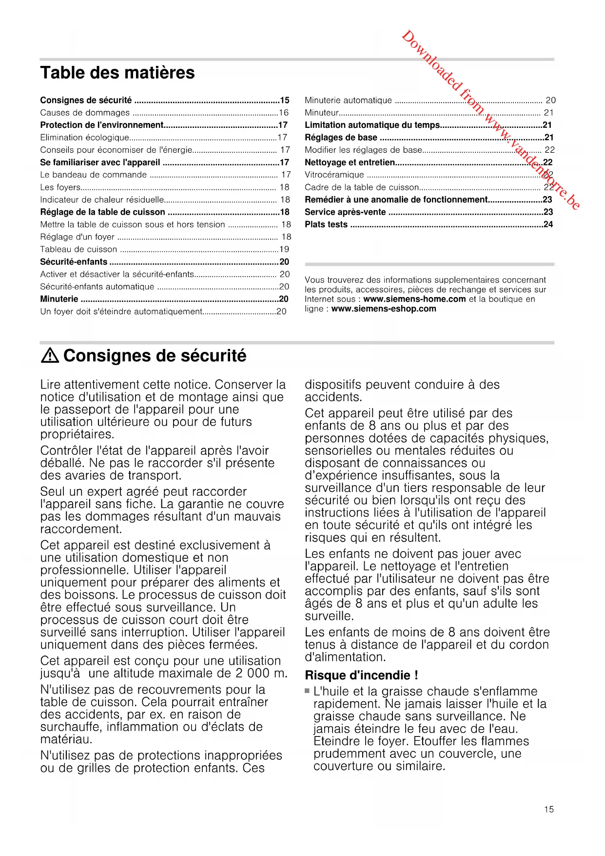 - Plats tests Produktinfo Vous trouverez des informations supplementaires concernant les produits, accessoires, pièces de rechange et services sur Internet sous : www.siemens-home.com et la boutique en ligne : www.siemens-eshop.com : Consignes de sécurité Lire attentivement cette notice. Conserver la notice d'utilisation et de montage ainsi que le passeport de l'appareil pour une utilisation ultérieure ou pour de futurs propriétaires. Contrôler l'état de l'appareil après l'avoir déballé. Ne pas le raccorder s'il présente des avaries de transport. Seul un expert agréé peut raccorder l'appareil sans fiche. La garantie ne couvre pas les dommages résultant d'un mauvais raccordement. Cet appareil est destiné exclusivement à une utilisation domestique et non professionnelle. Utiliser l'appareil uniquement pour préparer des aliments et des boissons. Le processus de cuisson doit être effectué sous surveillance. Un processus de cuisson court doit être surveillé sans interruption. Utiliser l'appareil uniquement dans des pièces fermées. Cet appareil est conçu pour une utilisation jusqu'à une altitude maximale de 2 000 m. N'utilisez pas de recouvrements pour la table de cuisson. Cela pourrait entraîner des accidents, par ex. en raison de surchauffe, inflammation ou d'éclats de matériau. N'utilisez pas de protections inappropriées ou de grilles de protection enfants. Ces dispositifs peuvent conduire à des accidents. Cet appareil peut être utilisé par des enfants de 8 ans ou plus et par des personnes dotées de capacités physiques, sensorielles ou mentales réduites ou disposant de connaissances ou d’expérience insuffisantes, sous la surveillance d'un tiers responsable de leur sécurité ou bien lorsqu'ils ont reçu des instructions liées à l'utilisation de l'appareil en toute sécurité et qu'ils ont intégré les risques qui en résultent. Les enfants ne doivent pas jouer avec l'appareil. Le nettoyage et l'entretien effectué par l'utilisateur ne doivent pas être accomplis par des enfants, sauf s'ils sont âgés de 8 ans et plus et qu'un adulte les surveille. Les enfants de moins de 8 ans doivent être tenus à distance de l'appareil et du cordon d'alimentation. Risque d'incendie ! p. 24