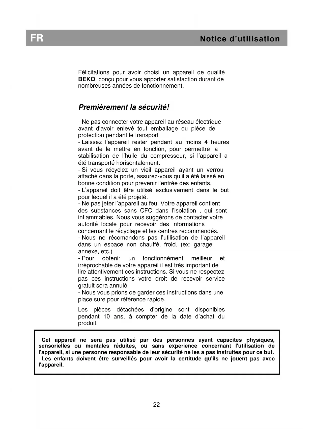 Premièrement la sécurité! - Ne pas connecter votre appareil au réseau électrique avant d’avoir enlevé tout emballage ou pièce de protection pendant le transport - Laissez l’appareil rester pendant au moins 4 heures avant de le mettre en fonction, pour permettre la stabilisation de l'huile du compresseur, si l’appareil a été transporté horisontalement. - Si vous récyclez un vieil appareil ayant un verrou attaché dans la porte, assurez-vous qu’il a été laissé en bonne condition pour prevenir l’entrée des enfants. - L’appareil doit être utilisé exclusivement dans le but pour lequel il a été projeté. - Ne pas jeter l’appareil au feu. Votre appareil contient des substances sans CFC dans l’isolation , qui sont inflammables. Nous vous suggérons de contacter votre autorité locale pour recevoir des informations concernant le récyclage et les centres recommandés. - Nous ne récomandons pas l’utilisation de l’appareil dans un espace non chauffé, froid. (ex: garage, annexe, etc.) - Pour obtenir un fonctionnément meilleur et irréprochable de votre appareil il est très important de lire attentivement ces instructions. Si vous ne respectez pas ces instructions votre droit de recevoir service gratuit sera annulé. - Nous vous prions de garder ces instructions dans une place sure pour réfèrence rapide. Les pièces détachées d’origine sont disponibles pendant 10 ans, à compter de la date d’achat du produit.