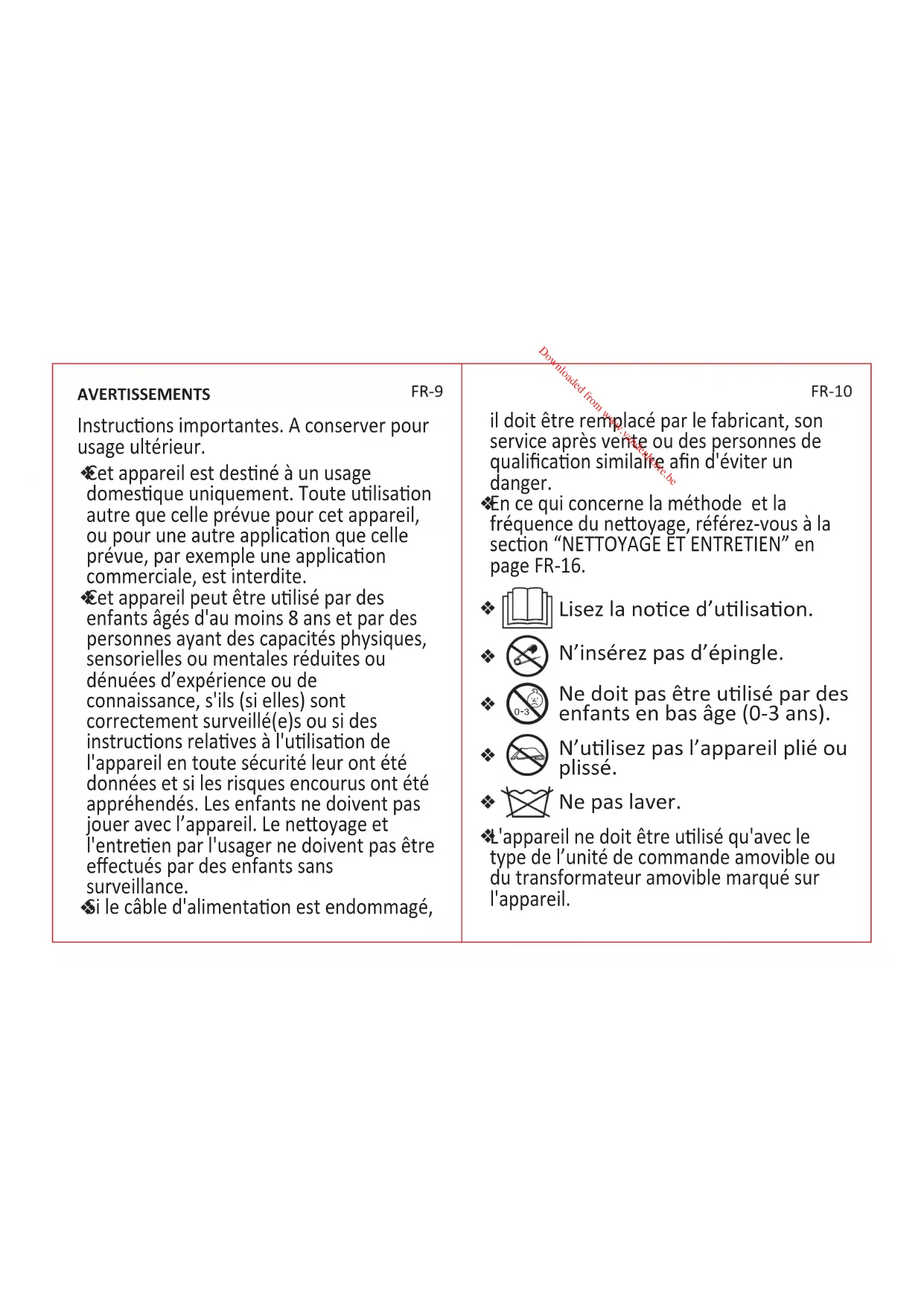 creased or folded. You must always use the heang pillow with the wrap. Downloaded from www.vandenborre.beAVERTISSEMENTS Instrucons importantes. A conserver pour usage ultérieur. Cet appareil est desné à un usage domesque uniquement. Toute ulisaon autre que celle prévue pour cet appareil, ou pour une autre applicaon que celle prévue, par exemple une applicaon commerciale, est interdite. Cet appareil peut être ulisé par des enfants âgés d'au moins 8 ans et par des personnes ayant des capacités physiques, sensorielles ou mentales réduites ou dénuées d’expérience ou de connaissance, s'ils (si elles) sont correctement surveillé(e)s ou si des instrucons relaves à l'ulisaon de l'appareil en toute sécurité leur ont été données et si les risques encourus ont été appréhendés. Les enfants ne doivent pas jouer avec l’appareil. Le neoyage et l'entreen par l'usager ne doivent pas être effectués par des enfants sans surveillance. Si le câble d'alimentaon est endommagé, il doit être remplacé par le fabricant, son service après vente ou des personnes de qualificaon similaire afin d'éviter un danger. En ce qui concerne la méthode et la fréquence du neoyage, référez-vous à la secon “NETTOYAGE ET ENTRETIEN” en page FR-16. Lisez la noce d’ulisaon. L'appareil ne doit être ulisé qu'avec le type de l’unité de commande amovible ou du transformateur amovible marqué sur l'appareil. N’insérez pas d’épingle. Ne doit pas être ulisé par des enfants en bas âge (0-3 ans). N’ulisez pas l’appareil plié ou plissé. Ne pas laver. Downloaded from www.vandenborre.beLorsque l’appareil n'est pas ulisé, le ranger comme indiqué. Au moment de ranger l'appareil, le laisser refroidir avant de le plier. Ne pas faire de faux plis à l'appareil en plaçant des objets dessus lorsqu'il est range. Examiner fréquemment l’appareil en vue de détecter des signes d’usure ou de détérioraon. En cas de mise en évidence de tels signes, si l’appareil a été ulisé de façon anormale ou s’il ne fonconne pas, le retourner au fournisseur avant de le mere en marche à nouveau. Cet appareil n'est pas desné à un usage médical dans les hôpitaux. Ne pas uliser humide. Cet appareil ne doit pas être ulisé par des personnes insensibles à la chaleur ou par d’autres personnes très vulnérables, incapables de réagir en cas de surchauffe. Les enfants de moins de trois ans ne doivent pas uliser cet appareil en raison de leur incapacité à réagir en cas de surchauffe. L'appareil ne doit pas être ulisé par les jeunes enfants de plus de trois ans sauf si les commandes ont été préréglées par un parent ou par une personne assurant la garde ou si l'on a expliqué les instrucons à l'enfant de manière adéquate pour qu'il puisse faire fonconner les commandes en toute sécurité. Lorsque l'appareil est suscepble d'être ulisé pendant une période prolongée, par exemple par un ulisateur qui s'endort, il convient que les commandes soient ajustées au réglage recommandé pour une ulisaon connue. L’interrupteur ou l’unité de commande ne doit pas être mouillé au cours du lavage et que, au cours du séchage, le câble doit être posionné de façon telle que l’eau ne pénètre pas dans l’interrupteur ou l’unité de commande.