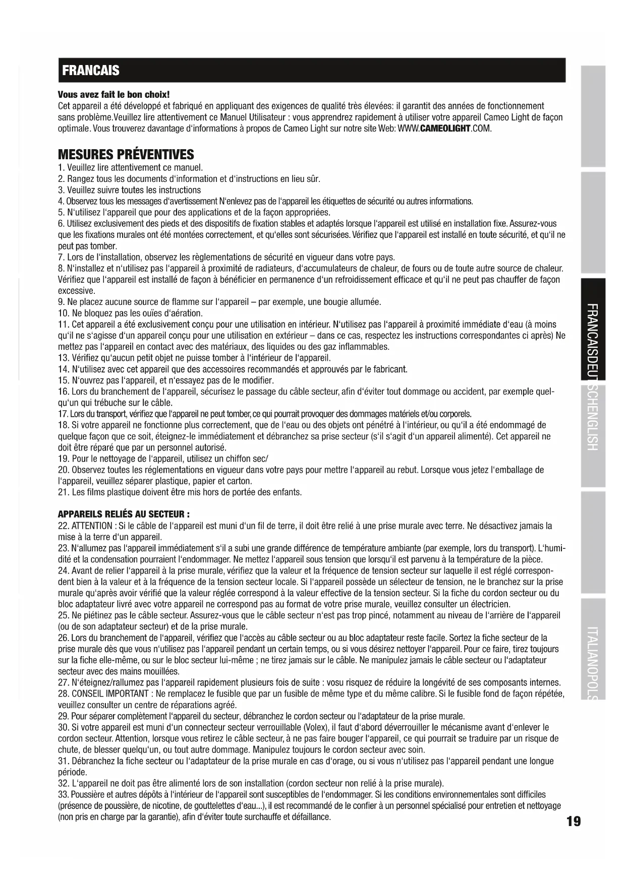 FRANCAIS Vous avez fait le bon choix! Cet appareil a été développé et fabriqué en appliquant des exigences de qualité très élevées: il garantit des années de fonctionnement sans problème.Veuillez lire attentivement ce Manuel Utilisateur : vous apprendrez rapidement à utiliser votre appareil Cameo Light de façon optimale. Vous trouverez davantage d‘informations à propos de Cameo Light sur notre site Web: WWW.CAMEOLIGHT.COM.