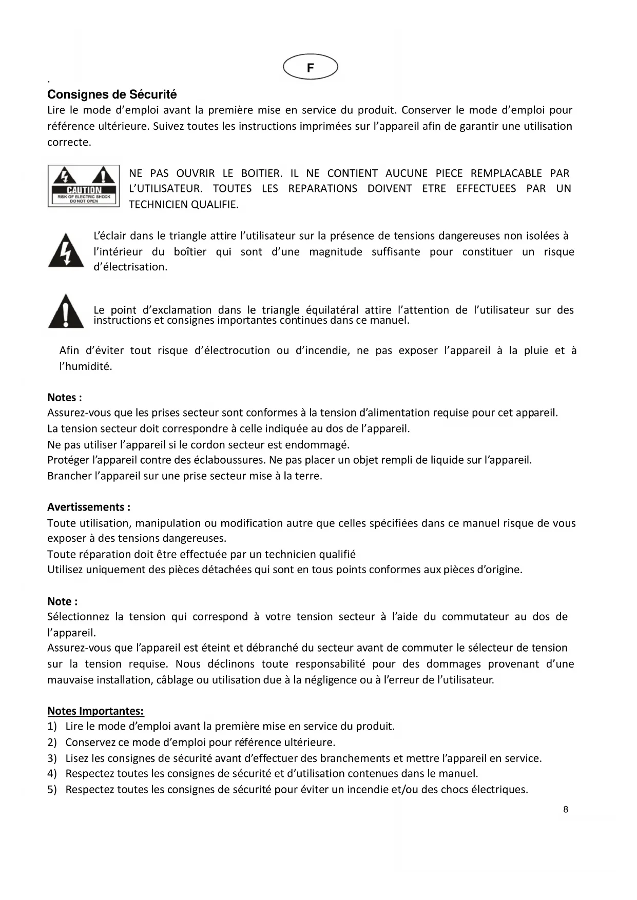 Le point d’exclamation dans le triangle équilatéral attire l’attention de l’utilisateur sur des instructions et consignes importantes continues dans ce manuel. Afin d’éviter tout risque d’électrocution ou d’incendie, ne pas exposer l’appareil à la pluie et à l’humidité. Notes : Assurez-vous que les prises secteur sont conformes à la tension d’alimentation requise pour cet appareil. La tension secteur doit correspondre à celle indiquée au dos de l’appareil. Ne pas utiliser l’appareil si le cordon secteur est endommagé. Protéger l’appareil contre des éclaboussures. Ne pas placer un objet rempli de liquide sur l’appareil. Brancher l’appareil sur une prise secteur mise à la terre. Avertissements : Toute utilisation, manipulation ou modification autre que celles spécifiées dans ce manuel risque de vous exposer à des tensions dangereuses. Toute réparation doit être effectuée par un technicien qualifié Utilisez uniquement des pièces détachées qui sont en tous points conformes aux pièces d’origine. Note : Sélectionnez la tension qui correspond à votre tension secteur à l’aide du commutateur au dos de l’appareil. Assurez-vous que l’appareil est éteint et débranché du secteur avant de commuter le sélecteur de tension sur la tension requise. Nous déclinons toute responsabilité pour des dommages provenant d’une mauvaise installation, câblage ou utilisation due à la négligence ou à l’erreur de l’utilisateur. Notes Importantes: