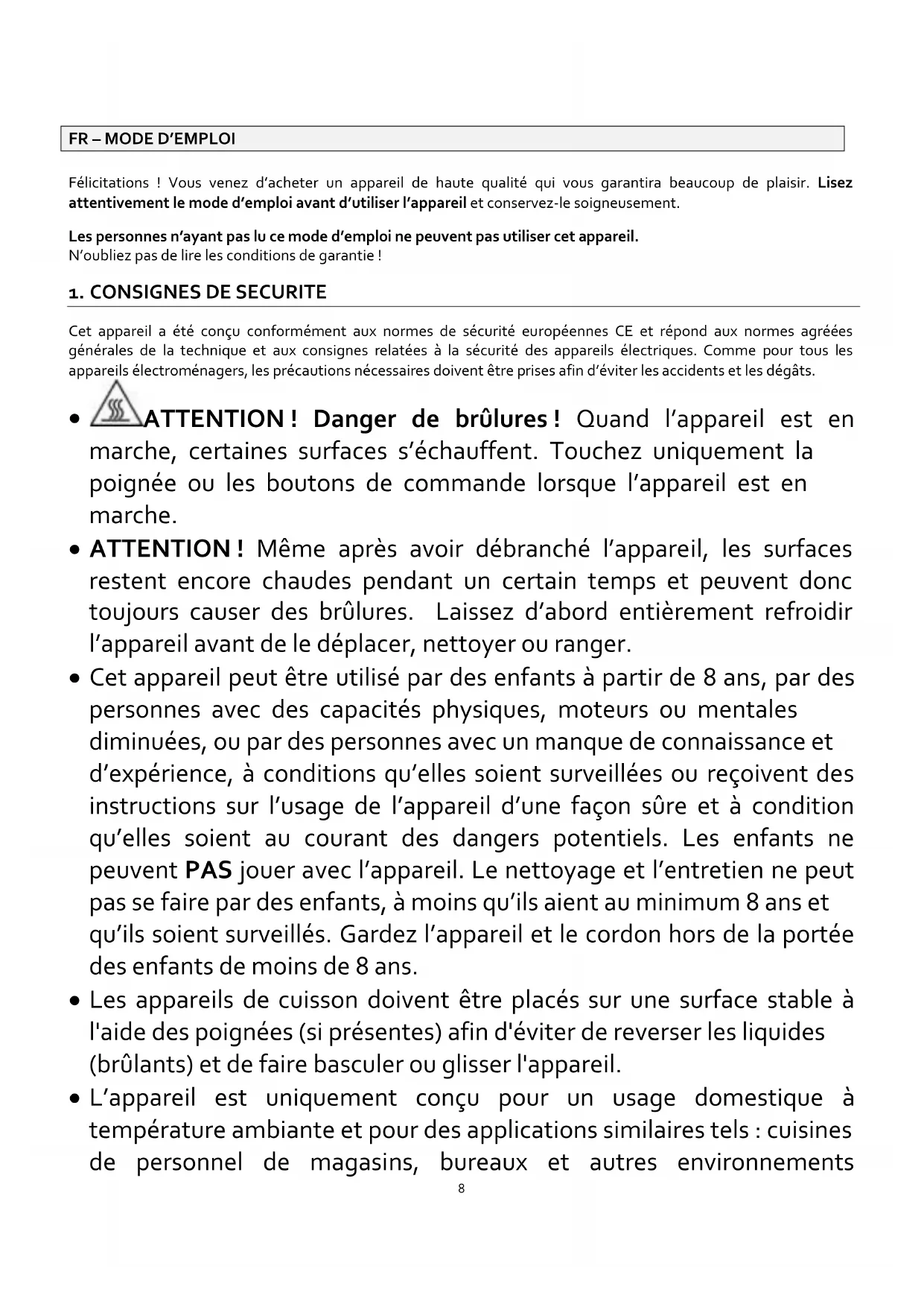 Cet appareil a été conçu conformément aux normes de sécurité européennes CE et répond aux normes agréées générales de la technique et aux consignes relatées à la sécurité des appareils électriques. Comme pour tous les appareils électroménagers, les précautions nécessaires doivent être prises afin d’éviter les accidents et les dégâts.