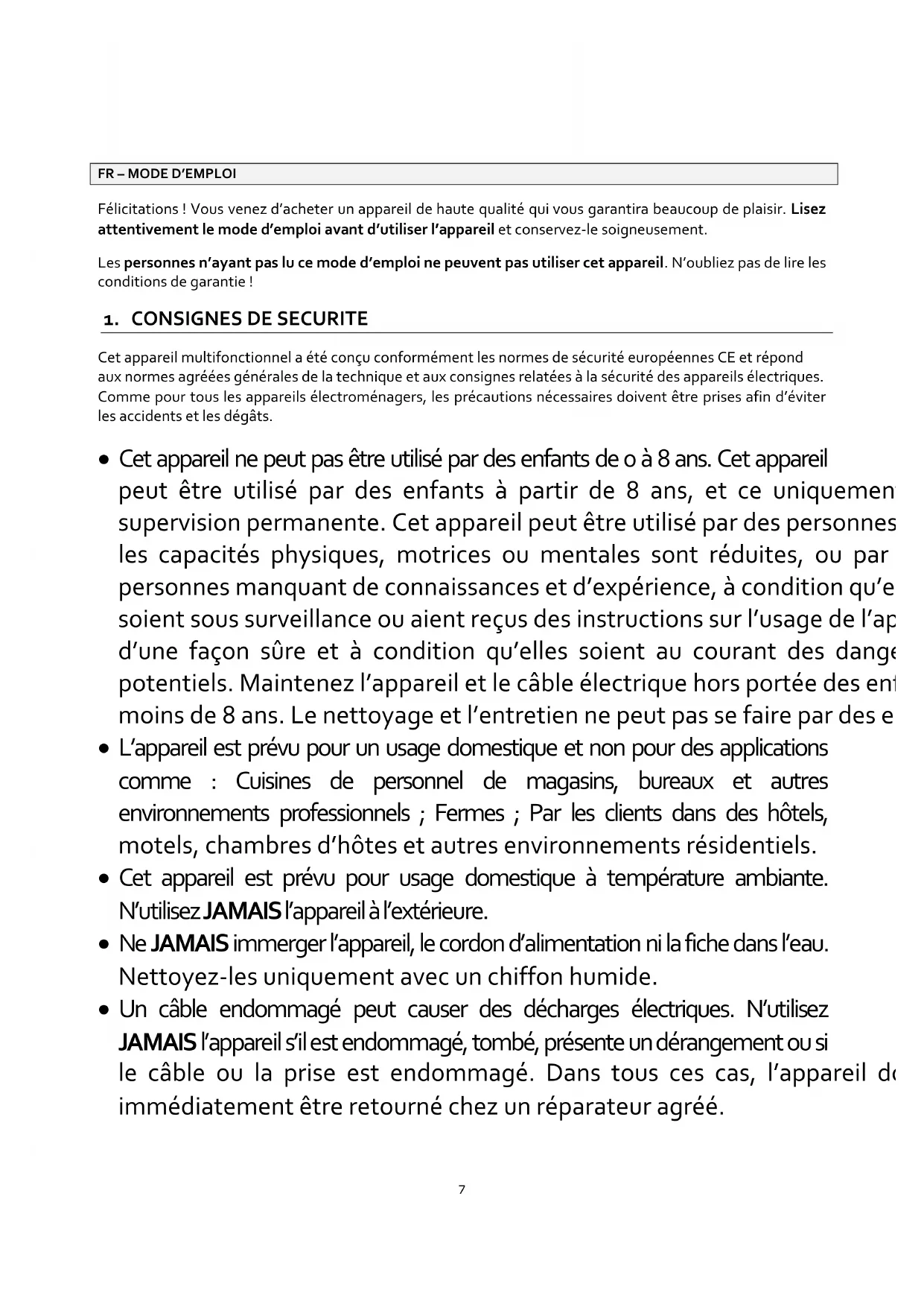 Cet appareil multifonctionnel a été conçu conformément les normes de sécurité européennes CE et répond aux normes agréées générales de la technique et aux consignes relatées à la sécurité des appareils électriques. Comme pour tous les appareils électroménagers, les précautions nécessaires doivent être prises afin d’éviter les accidents et les dégâts.