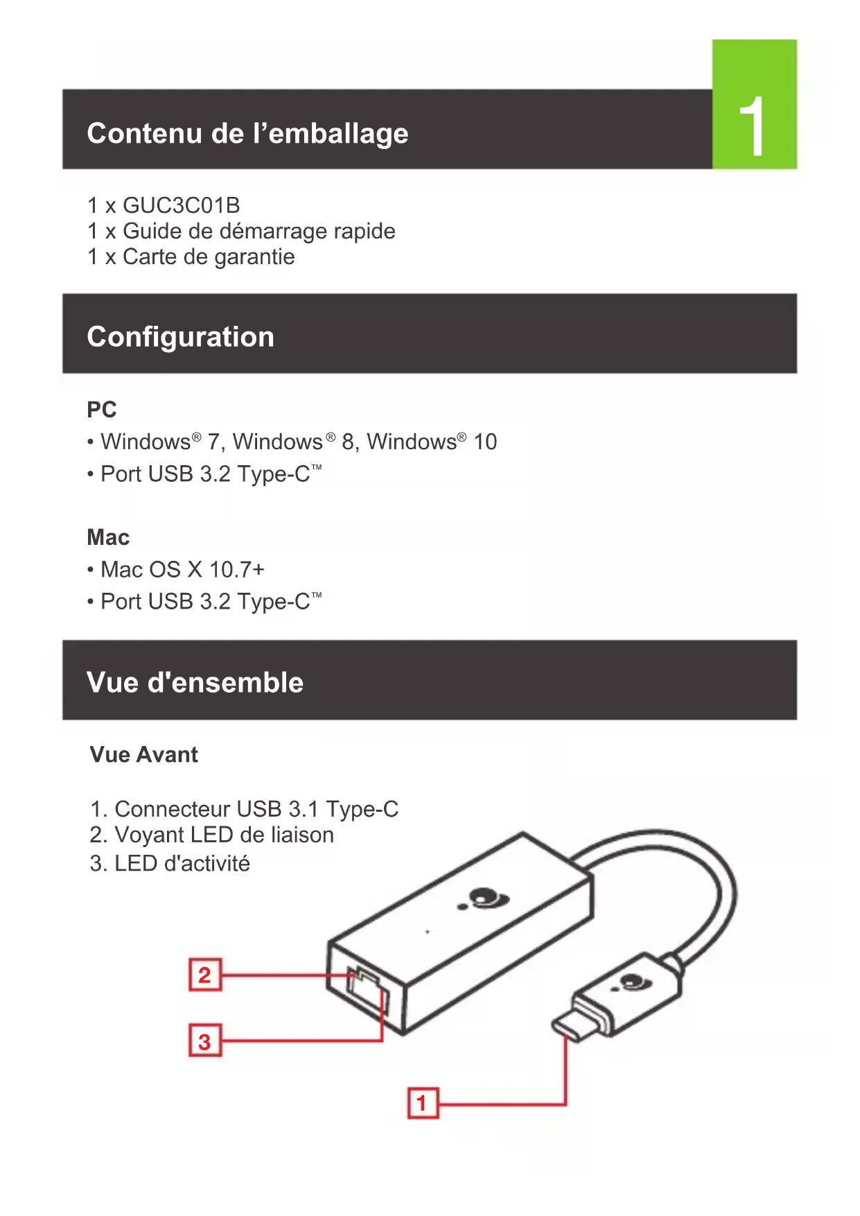 soutien technique en ligne IOGEAR https://iogear.custhelp.com support@iogear.com www.iogear.comDéclaration sur les interférences de la Commission fédérale des communications (FCC) Cet appareil a été testé et déclaré conforme aux limites pour appareils numériques de Classe B, conformément à la partie 15 des règles de la FCC. Ces limites sont conçues pour fournir une protection raisonnable contre les interférences nuisibles dans une installation résidentielle. Tous les changements ou modifications apportés à cet appareil peuvent annuler le droit de l’utilisateur de l’utiliser. Cet appareil génère, utilise et peut émettre de l’énergie de fréquence radio. S’il n’est pas installé et utilisé conformément aux instructions, il peut causer des interférences nuisibles aux communications radio. Toutefois, il n’y a aucune garantie que des interférences ne se produiront pas dans une installation particulière. Si cet appareil provoque des interférences nuisibles à la réception radio ou télévision, ce qui peut être déterminé en allumant et en éteignant l’appareil, l’utilisateur peut essayer de corriger les interférences en prenant une ou plusieurs des mesures suivantes : - Réorienter ou déplacer l’antenne de réception - Augmenter la distance entre l’appareil et le récepteur - Branchez l’appareil à une prise de courant sur un circuit différent de celui sur lequel le récepteur est connecté - Consulter le détaillant ou un technicien radio/TV expérimenté pour obtenir de l’aide Avertissement de la FCC : Les changements ou modifications non approuvés expressément par la partie responsable de la conformité pourraient annuler le droit de l’utilisateur d’utiliser cet appareil. Cet appareil est conforme à la partie 15 des règles de la FCC. Le fonctionne- ment est soumis aux deux conditions suivantes : (1) cet appareil ne doit pas causer d’interférence nuisible, et (2) cet appareil doit accepter toutes les interférences reçues, y compris les interférences qui peuvent provoquer un fonctionnement non désiré. Déclaration de la CE : Cet appareil a été testé et déclaré conforme aux directives de l’Union européenne : Capacités électromagnétiques (2004/108/CE), basse tension (2006/95/CE) et R&TTED (1999/5/CE). Déclaration de Conformité1 x GUC3C01B 1 x Guía de inicio rápido 1 x Tarjeta de garantía Contenidos del Paquete Requisitos Visión de conjunto Vista Frontal