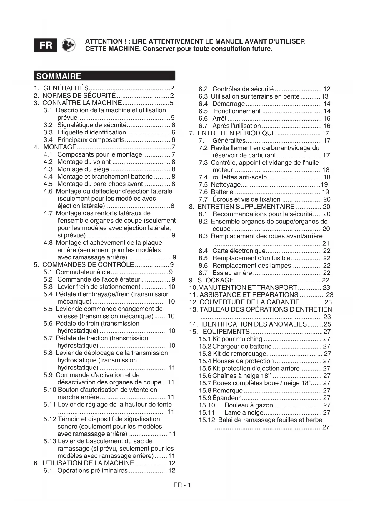 - L’usure normale des consommables comme les courroies de transmission, phares, roues, lames, boulons de sécurité et ls.