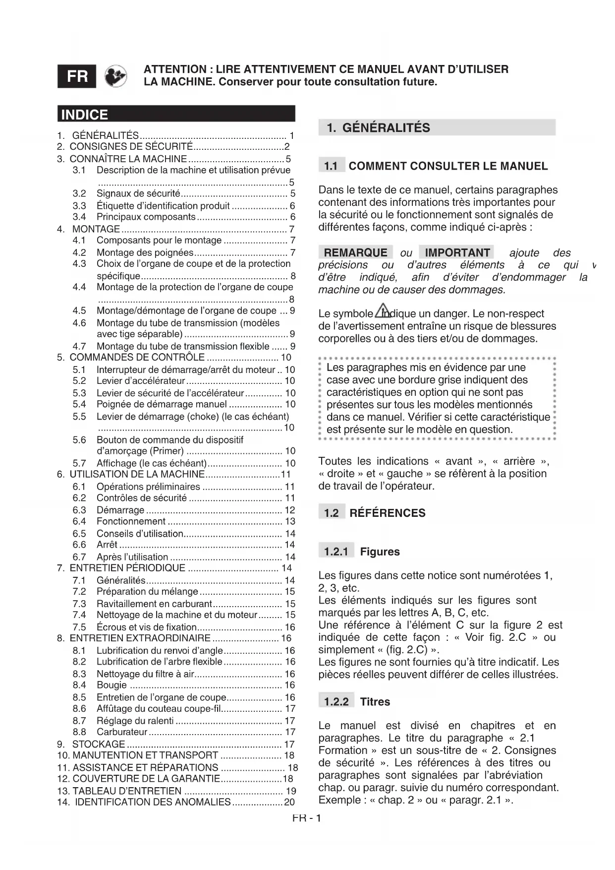 Le manuel est divisé en chapitres et en paragraphes. Le titre du paragraphe « 2.1 Formation » est un sous-titre de « 2. Consignes de sécurité ». Les références à des titres ou paragraphes sont signalées par l’abréviation chap. ou paragr. suivie du numéro correspondant. Exemple : « chap. 2 » ou « paragr. 2.1 ». ATTENTION : LIRE ATTENTIVEMENT CE MANUEL AVANT D’UTILISER LA MACHINE. Conserver pour toute consultation future.