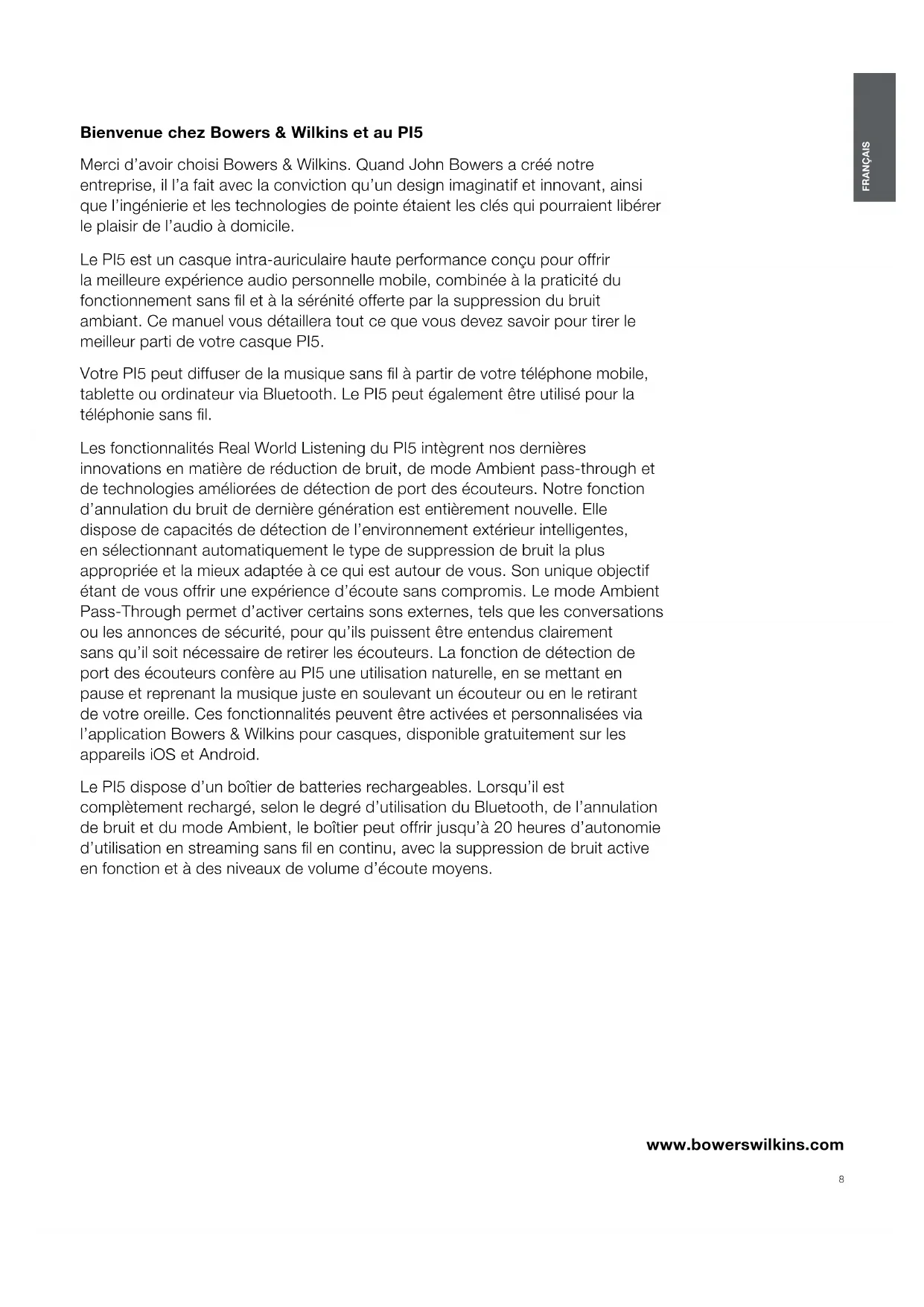 If you need help troubleshooting a specic problem, or simply have a question you would like answered, please initially consult the Headphone support section of the Bowers & Wilkins website: www.bowerswilkins.com. Diagram 5 Wearing your headphones7 ENGLISH Specications Technical Features True Wireless technology Bluetooth 5.0 with AptX technology Auto ANC Wireless and USB-C charging Fast charging support Bluetooth Codecs AptX AAC SBC Bluetooth Proles A2DP v1.3.1 AVRCP v1.6.1 HFP v1.7.1 HSP v1.2 BLE GATT (Generic Attribute Prole) Frequency Band Tx mode: 2402MHz to 2480MHZ, ISM Band, Rx mode: 2402MHz to 2480MHz, ISM Band RF output power <10.0 dBm Drive Units 9.2mm Dynamic Drive Frequency Range 10Hz to 20kHz Distortion (THD) <0.3% (1kHz/10mW) Battery Life Up to 4 hours Bluetooth Charging 15 minute charging = 2 hrs Bluetooth Inputs Bluetooth Weight 7g for earbuds, 47g for chargingcase8 FRANÇAIS www.bowerswilkins.com Bienvenue chez Bowers & Wilkins et au PI5 Merci d’avoir choisi Bowers & Wilkins. Quand John Bowers a créé notre entreprise, il l’a fait avec la conviction qu’un design imaginatif et innovant, ainsi que l’ingénierie et les technologies de pointe étaient les clés qui pourraient libérer le plaisir de l’audio à domicile. Le PI5 est un casque intra-auriculaire haute performance conçu pour offrir la meilleure expérience audio personnelle mobile, combinée à la praticité du fonctionnement sans l et à la sérénité offerte par la suppression du bruit ambiant. Ce manuel vous détaillera tout ce que vous devez savoir pour tirer le meilleur parti de votre casque PI5. Votre PI5 peut diffuser de la musique sans l à partir de votre téléphone mobile, tablette ou ordinateur via Bluetooth. Le PI5 peut également être utilisé pour la téléphonie sans l. Les fonctionnalités Real World Listening du PI5 intègrent nos dernières innovations en matière de réduction de bruit, de mode Ambient pass-through et de technologies améliorées de détection de port des écouteurs. Notre fonction d’annulation du bruit de dernière génération est entièrement nouvelle. Elle dispose de capacités de détection de l’environnement extérieur intelligentes, en sélectionnant automatiquement le type de suppression de bruit la plus appropriée et la mieux adaptée à ce qui est autour de vous. Son unique objectif étant de vous offrir une expérience d’écoute sans compromis. Le mode Ambient Pass-Through permet d’activer certains sons externes, tels que les conversations ou les annonces de sécurité, pour qu’ils puissent être entendus clairement sans qu’il soit nécessaire de retirer les écouteurs. La fonction de détection de port des écouteurs confère au PI5 une utilisation naturelle, en se mettant en pause et reprenant la musique juste en soulevant un écouteur ou en le retirant de votre oreille. Ces fonctionnalités peuvent être activées et personnalisées via l’application Bowers & Wilkins pour casques, disponible gratuitement sur les appareils iOS et Android. Le PI5 dispose d’un boîtier de batteries rechargeables. Lorsqu’il est complètement rechargé, selon le degré d’utilisation du Bluetooth, de l’annulation de bruit et du mode Ambient, le boîtier peut offrir jusqu’à 20 heures d’autonomie d’utilisation en streaming sans l en continu, avec la suppression de bruit active en fonction et à des niveaux de volume d’écoute moyens. FRANÇAIS Contents FRANÇAIS 8