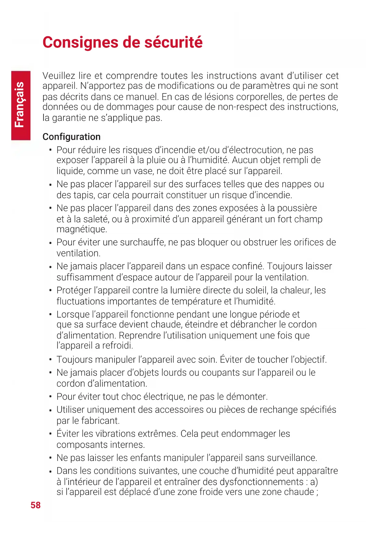 Protéger l’appareil contre la lumière directe du soleil, la chaleur, les fluctuations importantes de température et l’humidité.