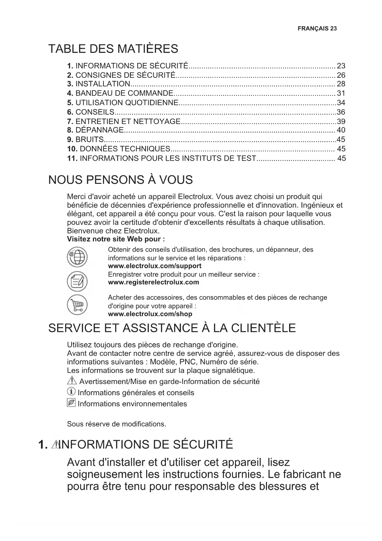Merci d'avoir acheté un appareil Electrolux. Vous avez choisi un produit qui bénéficie de décennies d'expérience professionnelle et d'innovation. Ingénieux et élégant, cet appareil a été conçu pour vous. C'est la raison pour laquelle vous pouvez avoir la certitude d'obtenir d'excellents résultats à chaque utilisation. Bienvenue chez Electrolux. Visitez notre site Web pour : Obtenir des conseils d'utilisation, des brochures, un dépanneur, des informations sur le service et les réparations : www.electrolux.com/support Enregistrer votre produit pour un meilleur service : www.registerelectrolux.com Acheter des accessoires, des consommables et des pièces de rechange d'origine pour votre appareil : www.electrolux.com/shop