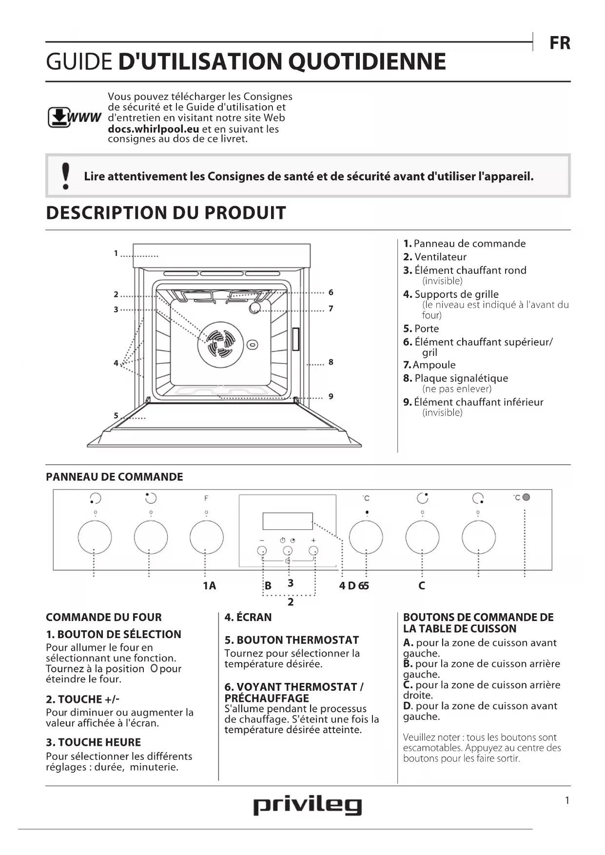 Lire attentivement les Consignes de santé et de sécurité avant d'utiliser l'appareil. WWW Vous pouvez télécharger les Consignes de sécurité et le Guide d'utilisation et d'entretien en visitant notre site Web docs.whirlpool.eu et en suivant les consignes au dos de ce livret.