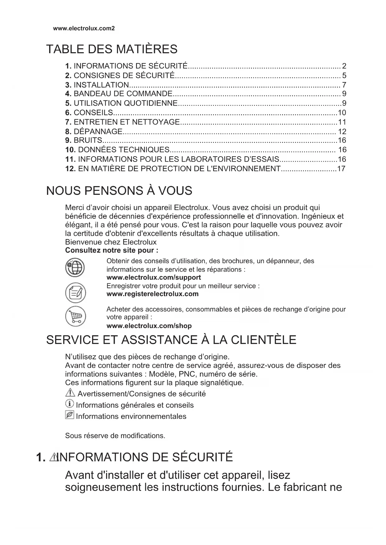Merci d’avoir choisi un appareil Electrolux. Vous avez choisi un produit qui bénéficie de décennies d'expérience professionnelle et d'innovation. Ingénieux et élégant, il a été pensé pour vous. C'est la raison pour laquelle vous pouvez avoir la certitude d'obtenir d'excellents résultats à chaque utilisation. Bienvenue chez Electrolux Consultez notre site pour : Obtenir des conseils d’utilisation, des brochures, un dépanneur, des informations sur le service et les réparations : www.electrolux.com/support Enregistrer votre produit pour un meilleur service : www.registerelectrolux.com Acheter des accessoires, consommables et pièces de rechange d’origine pour votre appareil : www.electrolux.com/shop