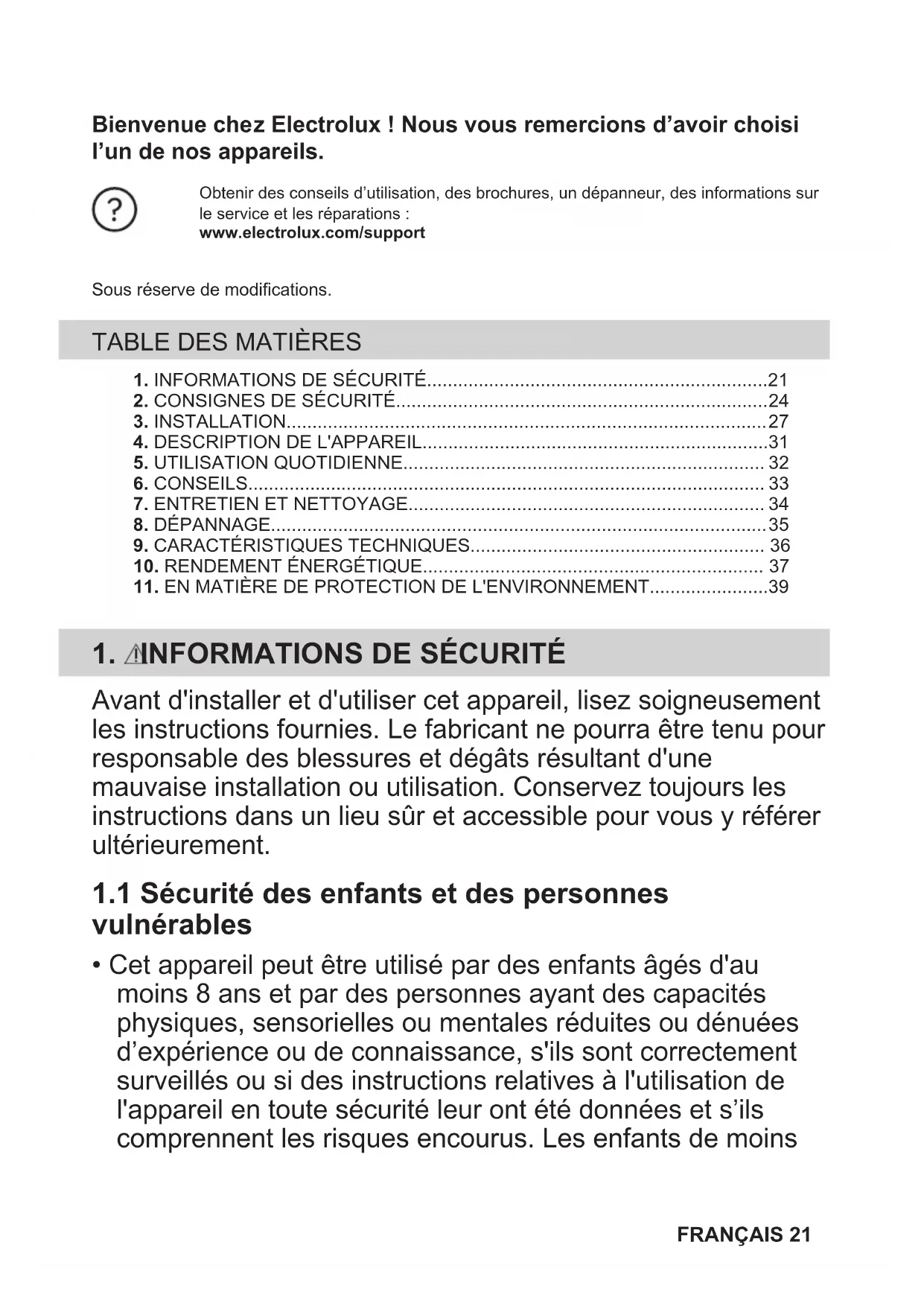 maximum requis pour atteindre le mode basse consommation applicable Consommation d'énergie pondérée en mode « arrêt » 0,3 W Temps maximum requis pour que l’équipement atteigne automatiquement le mode basse puissance applicable 2 min 38 FRANÇAIS11. EN MATIÈRE DE PROTECTION DE L'ENVIRONNEMENT Recyclez les matériaux portant le symbole . Déposez les emballages dans les conteneurs prévus à cet effet. Contribuez à la protection de l'environnement et à votre sécurité, recyclez vos produits électriques et électroniques. Ne jetez pas les appareils portant le symbole avec les ordures ménagères. Emmenez un tel produit dans votre centre local de recyclage ou contactez vos services municipaux. Electrolux Appliances AB - Contact Address: Al. Powstancow Slaskich 26, 30-570 Krakow, Poland Concerne la France uniquement : FRANÇAIS 39Willkommen bei Electrolux! Danke, dass Sie sich für unser Gerät entschieden haben. Um Anwendungshinweise, Prospekte, Informationen zu Fehlerbehebung, Service undReparatur zu erhalten:www.electrolux.com/supportÄnderungen vorbehalten. INHALTSVERZEICHNIS