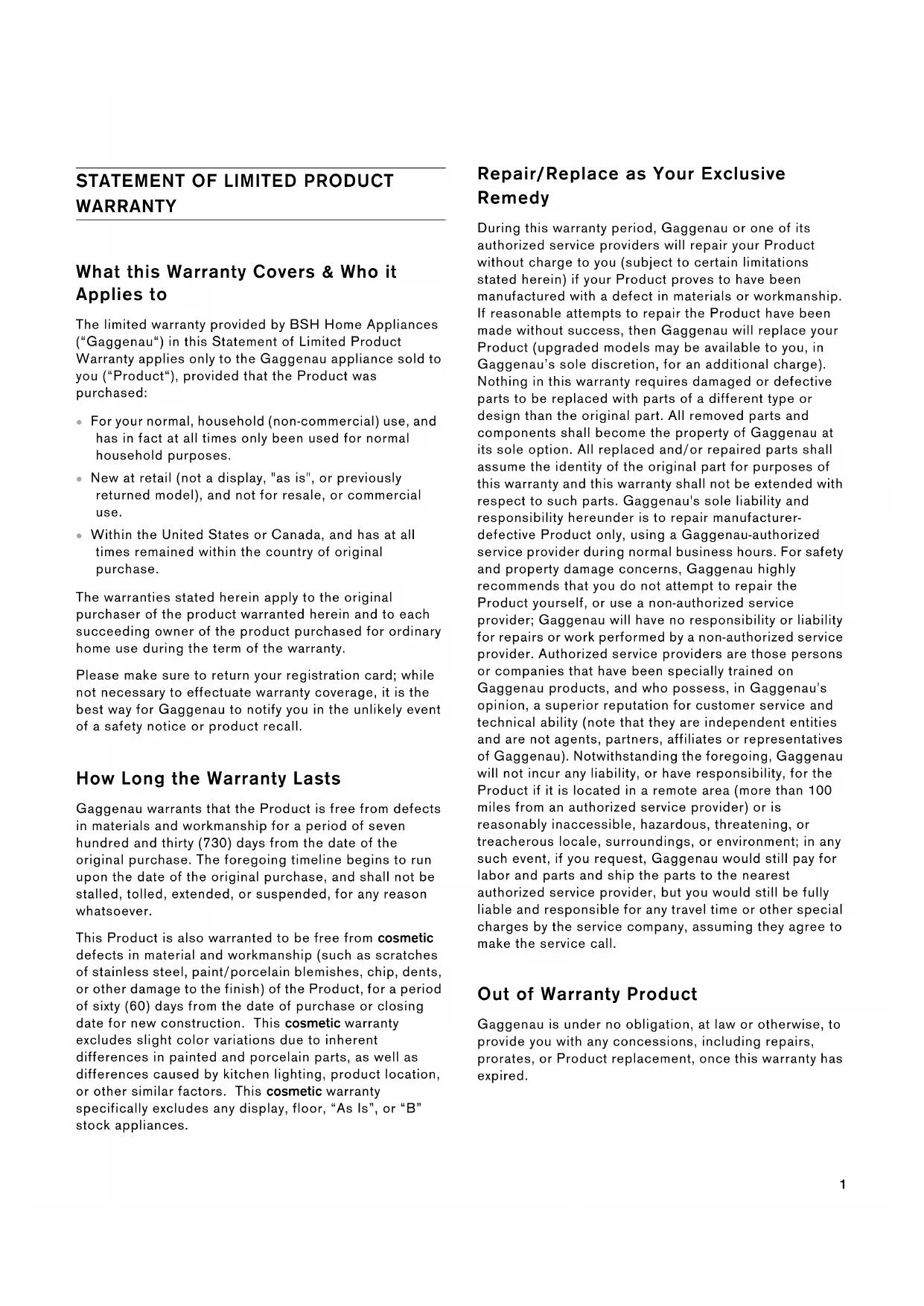 Couverture de la garantie limitée La garantie limitée fournie par BSH Home Appliances (« Gaggenau ») dans cet énoncé de garantie limitée s’applique seulement à l'appareil Gaggenau qui vous a été vendu (« Produit »), pour autant que le produit ait été acheté : ▯ Pour une utilisation normale, résidentielle (non commerciale), et qu’en fait, en tout temps, a été utilisé pour un usage domestique normal. ▯ Neuf au moment de la vente au détail (non en montre, « tel quel » ou un modèle retourné antérieurement), qu’il n’est pas destiné à la revente ni à un usage commercial. ▯ Aux États-Unis ou au Canada et qu’il est demeuré en tout temps dans le pays où l’appareil a été acheté. Les garanties aux présentes s’appliquent à l’acheteur original du Produit sous garantie et à tout propriétaire successif du produit acheté pour une utilisation résidentielle habituelle et la durée de la garantie. Assurez-vous de renvoyer la carte d'enregistrement; bien que cette démarche ne soit pas nécessaire pour que la garantie soit valide, c'est la meilleure façon de permettre à Gaggenau de vous avertir dans l'éventualité improbable d'un avis de sécurité ou d'un rappel du produit. Durée de la garantie Gaggenau garantit que le produit est exempt de défaut de matériau et de fabrication pour une période de sept cent trente (730) jours à compter de la date d’achat. La période susmentionnée commence à partir de la date d'achat et ne doit pas être retenue, retardée, prolongée, ou interrompue pour une raison quelconque. Ce produit est également garanti comme étant exempt de défaut esthétique au niveau du matériau et de la fabrication (par ex. d’égratignures sur l’acier inoxydable, d’imperfections au niveau de la peinture/porcelaine, d’éclats, de bosses ou autres dommages à la finition du produit), pour une période de soixante (60) jours à partir de la date d’achat ou de la date limite pour une construction neuve. La présente garantie esthétique exclut les variations légères de couleur causées par les différences inhérentes entre les sections peintes et les sections en porcelaine, de même que les différences causées par l'éclairage de la cuisine, l'emplacement du produit et autres facteurs similaires. La présente garantie esthétique exclut spécifiquement tous les appareils en montre, de plancher, « tel quel » et remis à neuf. Réparation ou remplacement : votre recours exclusif Pendant cette période de garantie, Gaggenau ou l'un de ses centres de réparations autorisés réparera gratuitement votre Produit (sous réserve de certaines restrictions aux présentes) si celui-ci présente des défauts de matériels ou de fabrication. Si des tentatives raisonnables pour réparer le produit sont vaines, alors Gaggenau remplacera le produit (un modèle supérieur peut être offert, à la seule discrétion de Gaggenau, moyennant des frais supplémentaires). Rien dans cette garantie n'exige que les pièces endommagées ou défectueuses soient remplacées par des pièces d'un type ou d'une conception différent de la pièce d'origine. Toutes les pièces ou les composants enlevés demeurent la seule propriété de Gaggenau. Toute pièce remplacée ou réparée doit être identique à la pièce d’origine aux fins de la présente garantie et la garantie ne sera pas prolongée en regard de telles pièces. La seule responsabilité de Gaggenau est de faire réparer le produit défectueux uniquement par un centre de réparation autorisé par Gaggenau pendant les heures de travail normales. Pour la sécurité et éviter des dommages matériels, Gaggenau recommande fortement de ne pas réparer le produit soi-même ni de le faire réparer par un centre de réparation non-autorisé; Gaggenau ne sera pas tenue responsable de réparations ou de travail effectués par un centre de réparation non autorisé. Les centres de réparation autorisés sont les personnes ou les entreprises qui ont été spécialement formées sur les produits Gaggenau et qui possèdent, selon l’opinion de Gaggenau, une réputation supérieure pour le service après-vente et la capacité technique (il est à noter qu’elles sont des entités indépendantes et non des agents, partenaires, affiliés ou représentants de Gaggenau). Nonobstant ce qui suit, Gaggenau ne sera pas tenue responsable d’aucune façon si le produit est situé dans une région éloignée (supérieure à 100 miles d’un centre de réparation autorisé) ou n’est pas accessible de façon raisonnable, dans un environnement ou un local dangereux, menaçant ou périlleux; dans une telle éventualité, à la demande du consommateur, Gaggenau pourrait encore payer les frais de main- d’œuvre et de pièces et expédier les pièces au centre de réparation autorisé le plus près, mais le consommateur serait entièrement responsable pour tous les frais de déplacement et autres frais spéciaux encourus par le centre de réparation, en autant qu’il accepte la demande de réparation. Produit hors garantie Gaggenau n’a aucune obligation, aux termes de la loi ou autrement, d’offrir toute concession, incluant réparation, prorata ou remplacement de produit une fois la garantie expirée.2 Exclusions de garantie La couverture de garantie décrite dans les présentes exclut tous les défauts ou dommages pour lesquels Gaggenau serait directement imputable, y compris, sans s'y limiter, l'un ou plusieurs des cas suivants : ▯ Utilisation du produit autre qu’un usage normal, habituel et de la façon destinée (incluant, sans s'y limiter, toute forme d’utilisation commerciale, d’utilisation ou de rangement d’un produit pour l’intérieur à l’extérieur, d'utilisation du produit de concert avec un transporteur aérien ou marin). ▯ Mauvaise conduite de toute partie, négligence, mauvaise utilisation, abus, accidents, fonctionnement inadéquat, mauvais entretien, installation ina