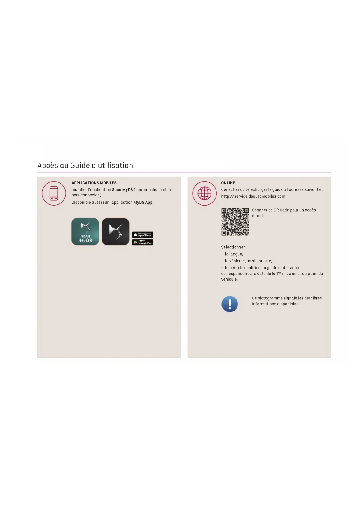GUIDE D'UTILISATIONAccès au Guide d'utilisation ONLINE Consulter ou télécharger le guide à l'adresse suivante: http://service.dsautomobiles.com Scanner ce QR Code pour un accès direct. Ce pictogramme signale les dernières informations disponibles.