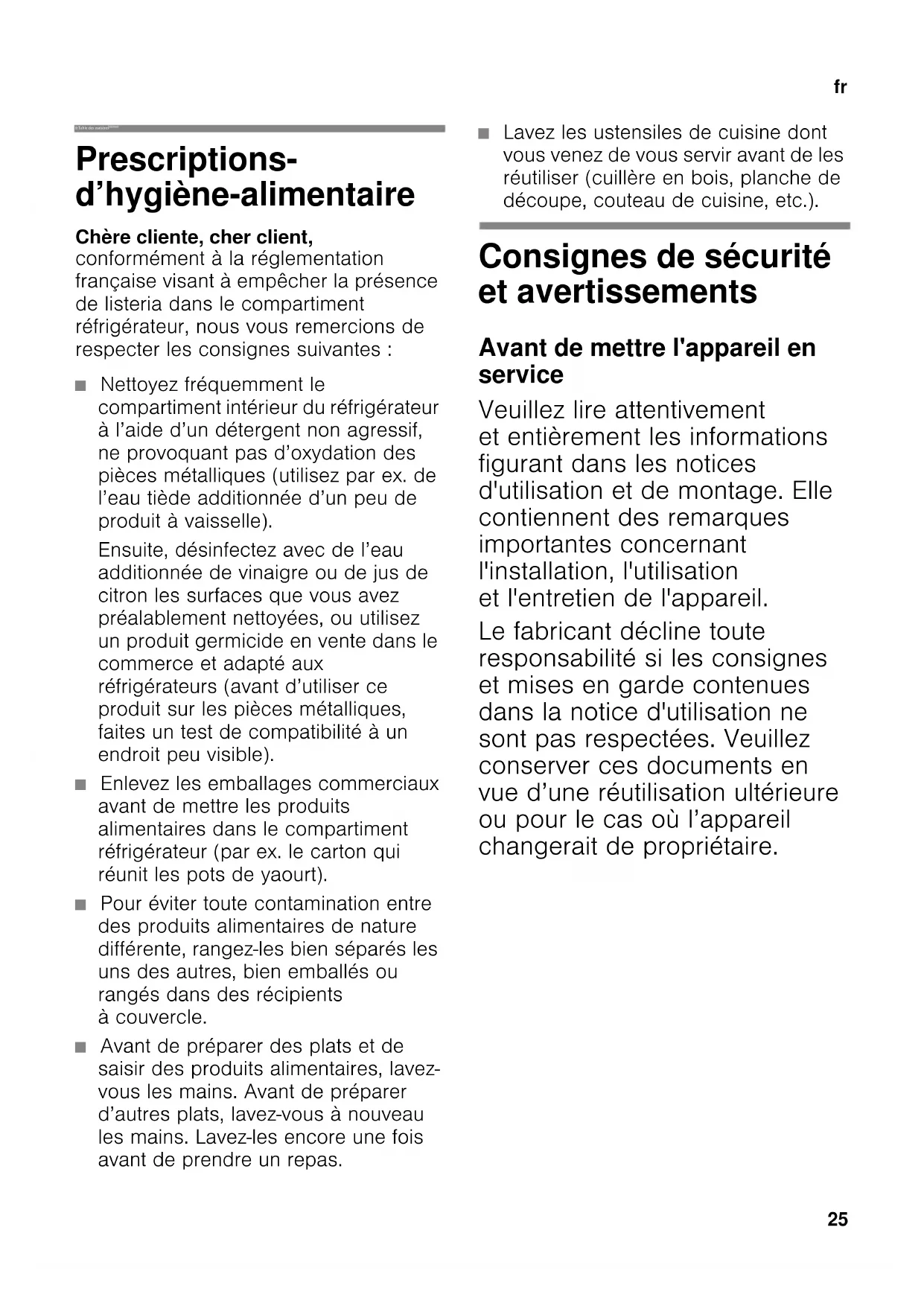frTable des matièresfrNotice d’utilisationCombiné réfrigérateur-congélateur Prescriptions- d’hygiène-alimentaire Chère cliente, cher client, conformément à la réglementation française visant à empêcher la présence de listeria dans le compartiment réfrigérateur, nous vous remercions de respecter les consignes suivantes : ■ Nettoyez fréquemment le compartiment intérieur du réfrigérateur à l’aide d’un détergent non agressif, ne provoquant pas d’oxydation des pièces métalliques (utilisez par ex. de l’eau tiède additionnée d’un peu de produit à vaisselle). Ensuite, désinfectez avec de l’eau additionnée de vinaigre ou de jus de citron les surfaces que vous avez préalablement nettoyées, ou utilisez un produit germicide en vente dans le commerce et adapté aux réfrigérateurs (avant d’utiliser ce produit sur les pièces métalliques, faites un test de compatibilité à un endroit peu visible). ■ Enlevez les emballages commerciaux avant de mettre les produits alimentaires dans le compartiment réfrigérateur (par ex. le carton qui réunit les pots de yaourt). ■ Pour éviter toute contamination entre des produits alimentaires de nature différente, rangez-les bien séparés les uns des autres, bien emballés ou rangés dans des récipients à couvercle. ■ Avant de préparer des plats et de saisir des produits alimentaires, lavez- vous les mains. Avant de préparer d’autres plats, lavez-vous à nouveau les mains. Lavez-les encore une fois avant de prendre un repas. ■ Lavez les ustensiles de cuisine dont vous venez de vous servir avant de les réutiliser (cuillère en bois, planche de découpe, couteau de cuisine, etc.). Consignes de sécurité et avertissements Avant de mettre l'appareil en service Veuillez lire attentivement et entièrement les informations figurant dans les notices d'utilisation et de montage. Elle contiennent des remarques importantes concernant l'installation, l'utilisation et l'entretien de l'appareil. Le fabricant décline toute responsabilité si les consignes et mises en garde contenues dans la notice d'utilisation ne sont pas respectées. Veuillez conserver ces documents en vue d’une réutilisation ultérieure ou pour le cas où l’appareil changerait de propriétaire.fr