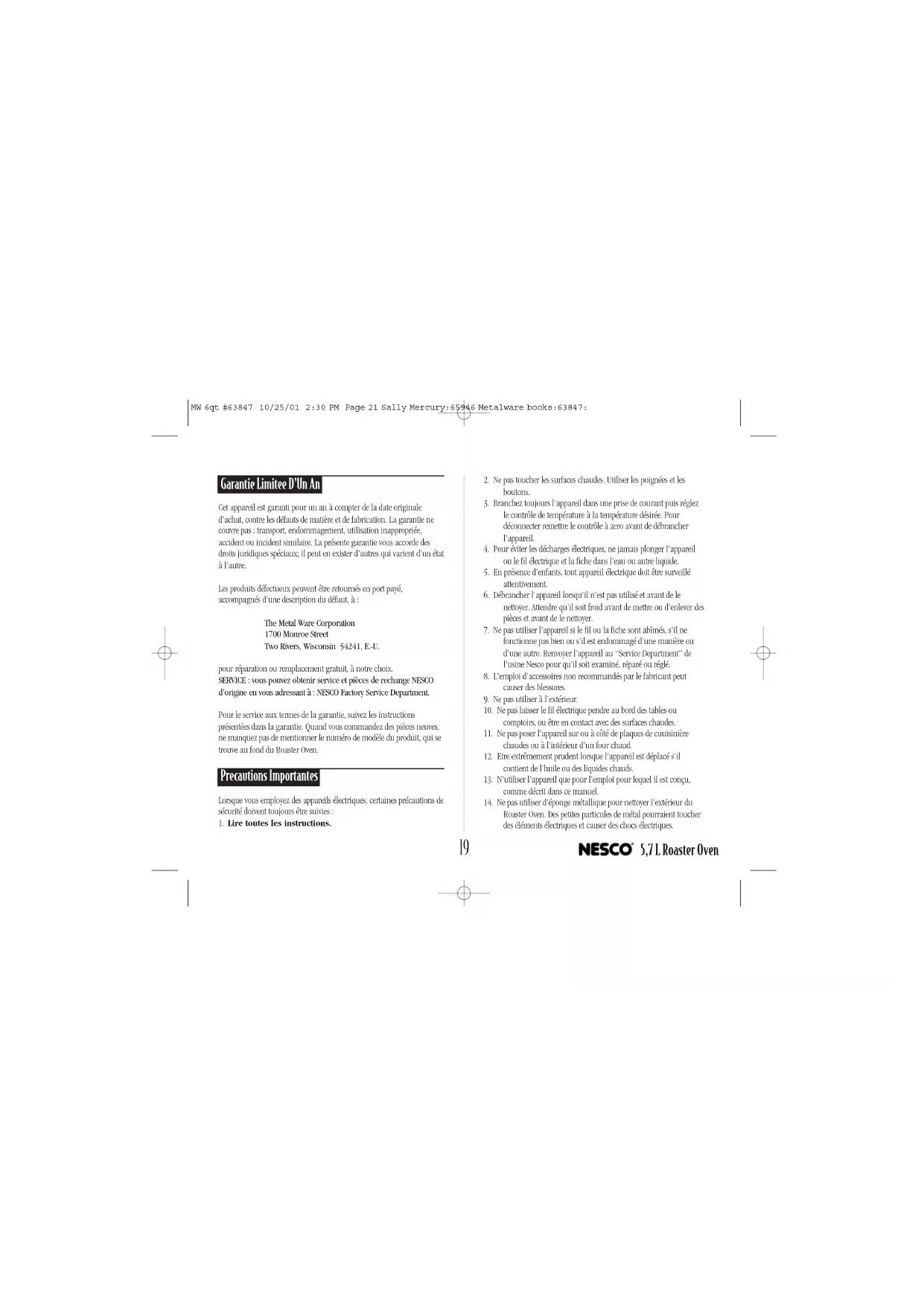 Roaster Oven. Des petites particules de métal pourraient toucher des éléments électriques et causer des chocs électriques. MW 6qt #63847 10/25/01 2:30 PM Page 21 Sally Mercury:65946 Metalware books:63847:20 Conservez Ces Instructions Cet appareil est strictement destiné à un emploi domestique. Il comporte un fil électrique très court pour éviter les accidents que pourrait causer un long fil. Des fils plus longs ou des rallonges peuvent être employés à condition que leurs spécifications soient égales ou supérieures aux spécifications de l’appareil. En outre, des soins spéciaux devront être mis en oeuvre pour éviter que des enfants puissent tirer sur le fil ou que l’on trébuche dans le fil. Guide D’utilisation Du Roaster Oven De 5,7 L Introduction du Roaster Oven NESCO