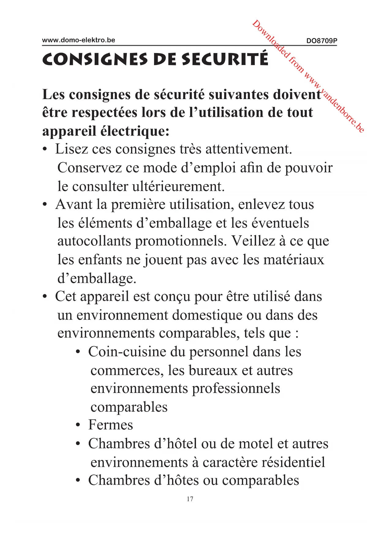 - Les accidents ou dommages causés par le non-respect de ces consignes sont à vos propres risques. Ni le fabricant, ni l’importateur, ni le fournisseur ne peuvent, dans ce cas, en être tenus pour responsables. CONSERVEZ CES CONSIGNES POUR POUVOIR LES CONSULTER ULTÉRIEUREMENT Downloaded from www.vandenborre.beDO8709P