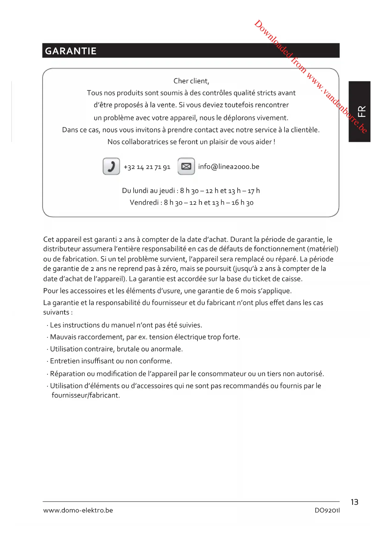 - Utilisation d’éléments ou d’accessoires qui ne sont pas recommandés ou fournis par le fournisseur/fabricant. Downloaded from www.vandenborre.be14 DO9201I