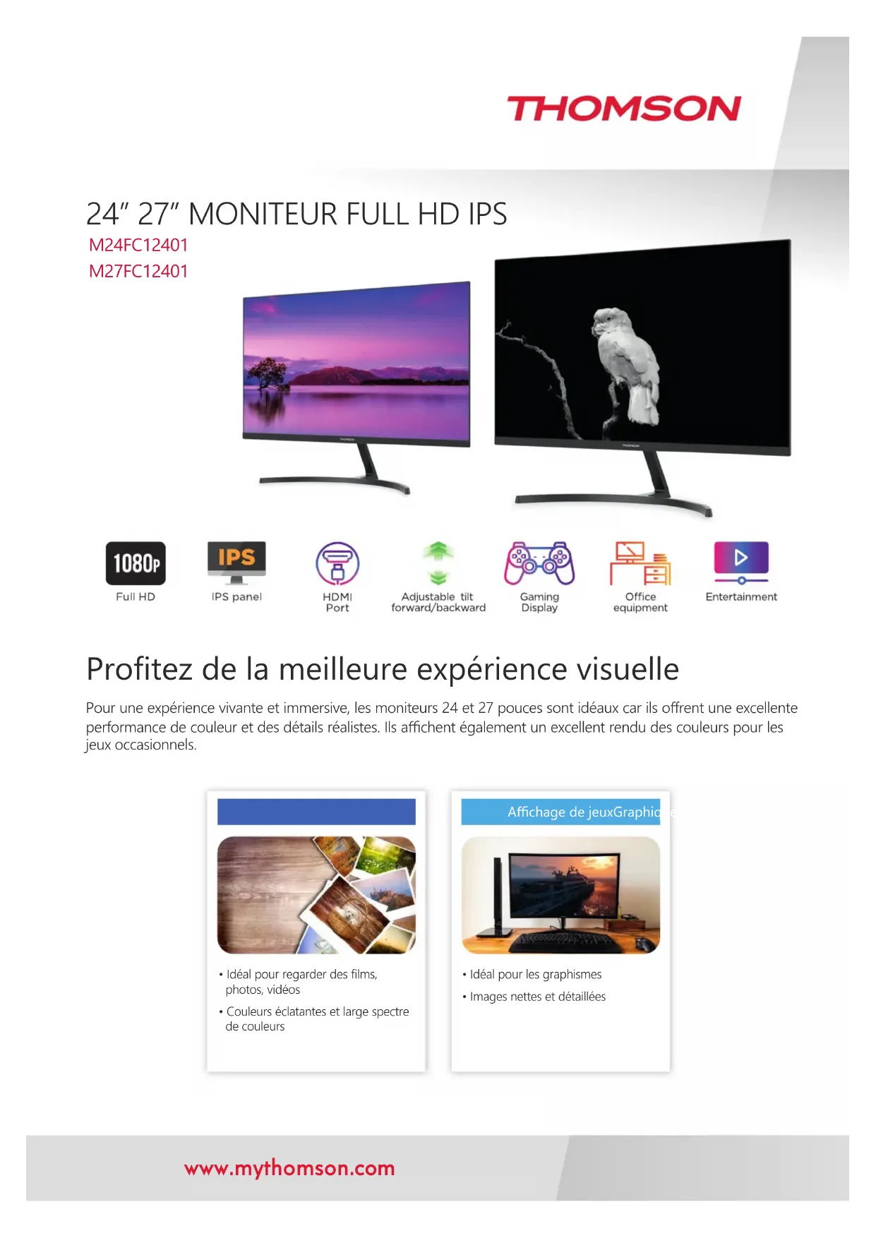 www.mythomson.com Protez de la meilleure expérience visuelle Pour une expérience vivante et immersive, les moniteurs 24 et 27 pouces sont idéaux car ils orent une excellente performance de couleur et des détails réalistes. Ils achent également un excellent rendu des couleurs pour les jeux occasionnels.